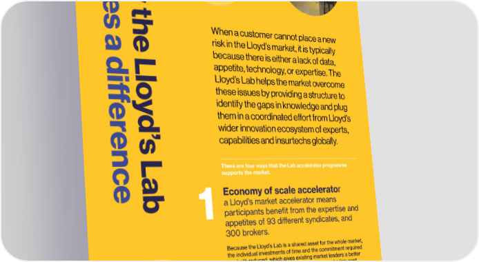 12 Lloyd’s Lab Impact Report 13 m H a o Signalling who are good partners to work with – k w t 2showcasing the abilities of potential tech partners, with instant reinforcement from e market peers. s h With over 100 new insurtechs being founded globally every month, it When a customer cannot place a new can be overly onerous for insurance entities to analyse the potential of these new companies and di昀昀erentiate between them. a e L risk in the Lloyd’s market, it is typically The Lloyd's Lab gives market organisations the opportunity to trial insurtech o昀昀erings in a safe environment, to take a closer look and d because there is either a lack of data, validate tech solutions and their bene昀椀ts by seeing the uptake from appetite, technology, or expertise. The peers at Demo Day, at the end of the programme. i l Lloyd’s Lab helps the market overcome o these issues by providing a structure to Better connection with the market er y identify the gaps in knowledge and plug demonstrating the convening power of Lloyd's, as the world's oldest and largest d them in a coordinated eort from Lloyd’s 3insurance marketplace. wider innovation ecosystem of experts, en ’ With a network of 335 brokers, 3950 coverholders, 93 syndicates s L capabilities and insurtechs globally. and 51 managing agents writing more than 200 di昀昀erent lines of business, the complexity of the marketplace and the wide variety of stakeholders makes it a real challenge for insurtechs to understand how the market works, how it is interconnected and c There are four ways that the Lab accelerator programme how their solution could 昀椀t in market organisations and be supports the market. e a implemented by them. The Lloyd's Lab provides a single point of access for insurtechs to b Economy of scale accelerator the entire Lloyd's market. a Lloyd’s market accelerator means 1 participants bene昀椀t from the expertise and appetites of 93 di昀昀erent syndicates, and New approaches, ways of working 300 brokers. and capabilities expanding the scope of the market o昀昀ering. Because the Lloyd’s Lab is a shared asset for the whole market, 4 the individual investments of time and the commitment required The format of the Lloyd's Lab means results can be shown quickly, are both reduced, which gives existing market leaders a better and market organisations that did not participate in the Lloyd's Lab way to access various avenues of innovation, and a low-cost can still take advantage of new solutions and be among the early window to test ideas before committing to them, encouraging adopters. participation across the market. Lloyd's needs emerging technologies because the insurance and risk landscape is continually evolving. As well as responding to emerging risks such as climate change and geopolitical threats, product innovation and data analytics have expanded the scope of commercial insurance solutions to o昀昀er coverage for a wider range of threats, exposures and perils. © Lloyd’s