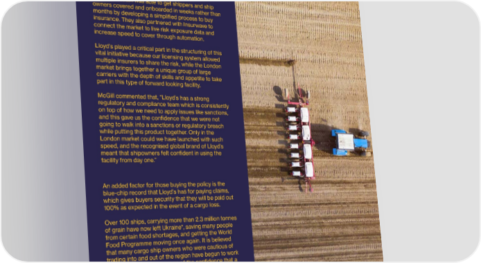 22 Lloyd’s Lab Impact Report 23 Lloyd’s market innovation beyond the LabAscot understood that London was the only international insurance market that would be able to consider this sort of challenging risk and set out to work with the teams at Lloyd’s to create a new joint Lloyd’s Lab supports the market’s innovation, but the market’s appetite facility (brokered by Marsh and with Ascot as lead and drive for innovation existed long before Lloyd’s Lab – as exempli昀椀ed underwriter) that could o昀昀er cover for grain moving in and out of Ukraine. by the Ukraine grain corridor insurance. The innovation was not technological, but 昀椀nding a way to tackle a societal challenge. The Ascot team was able to get shippers and ship owners covered and onboarded in weeks rather than months by developing a simpli昀椀ed process to buy insurance. They also partnered with Insurwave to connect the market to live risk exposure data and increase speed to cover through automation. The Ukrainian con昀氀ict has caused hardship and Lloyd’s played a critical part in the structuring of this su昀昀ering to millions, from those who were forced to vital initiative because our licensing system allowed become refugees, to the people who remain in the path multiple insurers to share the risk, while the London of the con昀氀ict. However, a global food crisis has also market brings together a unique group of large been narrowly averted. carriers with the depth of skills and appetite to take part in this type of forward looking facility. “ The ‘AsOne’ Ukrainian grain facility is a McGill commented that, “Lloyd’s has a strong perfect example of how the Lloyd’s market regulatory and compliance team which is consistently on top of how we need to apply issues like sanctions, uniquely brings together skilled teams that and this gave us the con昀椀dence that we were not are able to mobilise at speed and facilitate a going to walk into a sanctions or regulatory breach while putting this product together. Only in the bold solution in a time of crisis."London market could we have launched with such speed, and the recognised global brand of Lloyd’s Chris McGill - Class Underwriter, Head of Cargo, Ascot meant that shipowners felt con昀椀dent in using the facility from day one.” Ukraine grows 10% of the world’s wheat, and 40% of the World Food Programme’s wheat supplies. Much of this is exported to Africa – a region which is already An added factor for those buying the policy is the dangerously near the margins on food shortages blue-chip record that Lloyd’s has for paying claims, because of its extreme climate and harsh economics. which gives buyers security that they will be paid out 100% as expected in the event of a cargo loss. When Russia blockaded ships from leaving Ukrainian ports in February 2022, there was a real and immediate Over 100 ships, carrying more than 2.3 million tonnes risk that the July harvest from the Ukraine would not be of grain have now left Ukraine*, saving many people able to be shipped to Africa, and that as a result, many from certain food shortages, and getting the World millions of people would face famine this year. The UN Food Programme moving once again. It is believed acted decisively and was eventually able to work with that many cargo ship owners who were cautious of Russia and Ukraine to broker a deal that would allow trading into and out of the region have begun to work cargo ships to bring grain through the contested these routes again because of the con昀椀dence that a waters. However, for shipowners to be willing to carry globally recognised insurance policy gives them. cargos to and from the region, there needed to be an available insurance cover for the cargos. Otherwise the Everyone at Ascot, Marsh, Lloyd’s and from the risk was perceived to be too high. following participants in the facility is proud of this example of how Lloyd’s can ful昀椀l its purpose: sharing risk to create a braver world. *Source: UN Joint Coordination Centre. As at September 9th 2022 © Lloyd’s