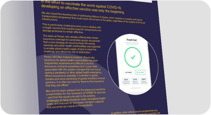 42 New products/ MGA Lloyd’s Lab Impact Report 43 A new strategy for insuring With this insight in mind, delivering that innovative insurance was the objective behind Parsyl’s launch of life-saving vaccines the new Global Health Risk Facility (GHRF), anchored Cohort 1, 2018 by their ‘Syndicate in a Box’, which serves as the market’s dedicated risk facility for COVID-related transit and storage risks in the developing world. As a nod to the long history of the global 昀椀ght for In the e昀昀ort to vaccinate the world against COVID-19, vaccination, the Syndicate was given the number ‘1796’ in honour of the year physician Edward Jenner carried out his 昀椀rst experiments into developing the developing an e昀昀ective vaccine was only the beginning. smallpox vaccine. We also faced the daunting task of distributing billions of doses, which requires a complex and robust Ben explains what the team managed to put in place. transportation programme that could reach all corners of the globe, regardless of the quality of the local “In the GHRF, Syndicate 1796 will be backed with infrastructure. capital from the U.S International Development Finance Corporation, allowing it to share risks with leading This is particularly challenging when you’re dealing with cargo syndicates and make better, fairly priced a fragile vaccine that requires speci昀椀c temperature and coverage available in low to upper middle-income storage protocols to remain e昀昀ective. countries. The GHRF o昀昀ers ‘All Risk’ cargo coverage for transit and storage risks on all global health The team at Parsyl, who already o昀昀ered data-driven products related to COVID-19 and any other infectious insurance coverage for perishable goods, recognised disease control and prevention programmes.” that a new strategy for insuring these life-saving vaccines and other health commodities was essential Importantly, the GHRF also o昀昀ers coverage, via direct to enable global health supply chains to meet the insurance or reinsurance, for in-country risks to ensure challenge and a昀昀ord the risk of distribution. “ We’ve seen Lloyd’s stand behind risks to vaccines and other commodities were protected as they were stored in central warehouses and travelled Parsyl CEO Ben Hubbard explains: “Previously, some of the world’s greatest achievements through health systems to the last mile. The focus was insurance for global health commodities has been and innovations. We asked, why not find a very much on supporting countries where the help was fragmented, expensive and di昀漀cult to source. most needed, and GHRF backed the global distribution Insurance contracts sometimes don’t cover risks way to stand behind the largest vaccine of products to developing countries. associated with the sudden changes that can occur campaign in human history.” during a pandemic or other global health emergency. This unique partnership was a real demonstration of When insurance is available, it is limited to global Ben Hubbard - CEO, Parsyl the boldness and ingenuity the Lloyd’s market can transits and once ownership of goods transfers to local bring to help address a global health emergency. Not partners, it is often too hard for them to 昀椀nd insurance only was the risk-sharing programme unique, but the that they can a昀昀ord.” creation of a public-private syndicate to address a global health emergency was the 昀椀rst in the 330-year Ben and his team realised that the status quo would be history of Lloyd’s. a real inhibitor for the movement of COVID-19 vaccines – and that this would only add to the existing COVID-19 was of course the biggest focus. Ben challenges of rising insurance costs, increasing freight realised that “once a COVID-19 vaccine became costs, and reduced air and ocean transport capacity available, it would be critical that we protect and deliver that occurred as a result of the pandemic. every dose. Doing this required us to innovate, working with all our market partners, and use our combined expertise and strong partnerships to take a completely In addition, other critical vaccine programmes (e.g. new approach to this speci昀椀c insurance - one that can measles and polio) in many developing countries had complement the manufacturing and distribution been halted because of COVID-19. These urgently objectives of major COVID-19 vaccine development needed to be restarted, despite the pandemic-imposed e昀昀orts.” challenges in transport and insurance. “We saw that a combined e昀昀ort across public and private partners in Hubbard continued, “We’ve seen Lloyd’s stand behind cargo insurance and technology was needed to risks to some of the world’s greatest achievements and uniquely understand and share risk so that life-saving innovations. We asked, why not 昀椀nd a way to stand vaccines and health products could be safely delivered behind the largest vaccine campaign in human wherever they were needed.” history?” © Lloyd’s