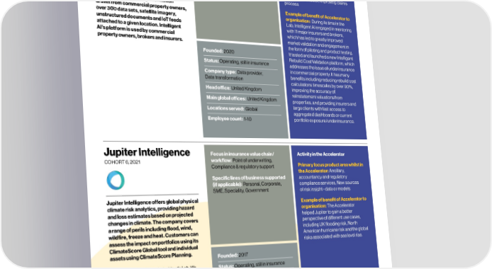 92 Data and models – Alumni profiles Lloyd’s Lab Impact Report 93 Intelligent AI Focus in insurance value chain/ Activity in the Accelerator Kovrr Focus in insurance value chain/ Activity in the Accelerator COHORT , workflow: Risk mitigation, Point of COHORT , workflow: Risk mitigation, Point of underwriting, Claims Primary focus product area whilst in underwriting, Compliance & regulatory Primary focus product area whilst in the Accelerator: Improving UW tools support the Accelerator: Improving UW tools Specific lines of business supported and processes, New sources of risk and processes, New sources of risk (if applicable): Corporate, insight - data or models, Data, product & Specific lines of business supported insight - data or models Reinsurance, Captive service consolidator, Improving claims (if applicable): Corporate, SME process Example of benefit of Accelerator to Intelligent AI creates 'Digital Twins' of Kovrr allows global enterprises and (re) organisation: During its time in the locations by integrating information Example of benefit of Accelerator to insurers to quantify the financial impact of Accelerator, Kovrr developed its drawn from commercial property owners, organisation: During its time in the cyber risk. The company’s platform is CRA-Zones framework, now known as over 300 data sets, satellite imagery, Lab, Intelligent AI engaged in mentoring used for planning cybersecurity budgets, CRIMZON, which is used to monitor unstructured documents and IoT feeds with 11 major insurers and brokers, communicating risk to boards of directors, cyber risk accumulations. CRIMZON attached to a given location. Intelligent which has led to greatly improved prioritising new initiatives, buying cyber allows insurers to analyse multiple AI’s platform is used by commercial market validation and engagement in insurance, and reporting to regulators. portfolios and group risk by geography, property owners, brokers and insurers. the form of piloting and product testing. industry or entity size.. Founded: 2020 It tested and launched a new Intelligent Founded: 2017 Rebuild Cost Validation platform, which Status: Operating, still in insurance addresses the issue of underinsurance Status: Operating, still in insurance Company type: Data provider, in commercial property. It has many Company type: Data models, Data transformation benefits including reducing rebuild cost data provider calculations timescales by over 90%, Head oce: United Kingdom improving the accuracy of Head oce: Israel reinstatement valuations from Main global oces: United Kingdom properties, and providing insurers and Main global oces: Eastern large clients with fast access to Mediterranean Locations served: Global aggregated dashboards or current Locations served: Global Employee count: 1-10 portfolio exposure/underinsurance. Employee count: 11-100 Jupiter Intelligence Focus in insurance value chain/ Activity in the Accelerator Merkle Science Focus in insurance value chain/ Activity in the Accelerator COHORT , workflow: Point of underwriting, COHORT , workflow: Point of underwriting Compliance & regulatory support Primary focus product area whilst in Primary focus product area whilst in the Accelerator: Ancillary, Specific lines of business supported the Accelerator: New sources of risk Specific lines of business supported accountancy and regulatory (if applicable): Speciality insight - data or models (if applicable): Personal, Corporate, compliance services, New sources SME, Speciality, Government of risk insight - data or models Example of benefit of Accelerator to organisation: In the Lloyd's Lab Jupiter Intelligence offers global physical Example of benefit of Accelerator to Merkle Science specialises in Accelerator, Merkle Science created a climate risk analytics, providing hazard organisation: The Accelerator providing risk and intelligence Crypto and DeFi risk data platform to and loss estimates based on projected helped Jupiter to gain a better data about the Crypto and DeFi help insurers underwrite and monitor changes in climate. The company covers perspective of dierent use cases, (Decentralised Finance) market. Its Crypto and DeFi policyholders. a range of perils including flood, wind, including UK flooding risk, North capabilities include transaction wildfire, freeze and heat. Customers can American hurricane risk and the global modelling, risk scoring and crime assess the impact on portfolios using its risks associated with sea level rise. detection and investigation. Merkle ClimateScore Global tool and individual Science oers data to help insurers assets using ClimateScore Planning. Founded: 2017 underwrite and monitor Crypto Founded: 2018 and DeFi policyholders. “In 2021 Jupiter took part in the Lloyd’s Lab. We Status: Operating, still in insurance Status: Operating, still in insurance worked closely with four syndicates and insurers to analyse a selection of datasets in ClimateScore Company type: Data models Company type: Data provider Global. This provided insights and perspectives around use cases such as UK flooding, North Head oce: USA Head oce: Singapore American hurricane and sea level rise.” Main global oces: USA Main global oces: Singapore, USA, Jessyla Reedha, Head of Sales EMEA UK, India Locations served: Global Locations served: Global Employee count: 101-200 Employee count: 11-100 © Lloyd’s