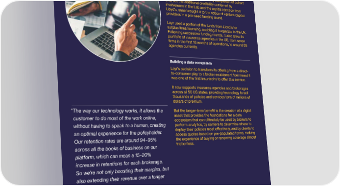 50DistributionLloyd’s Lab Impact Report 51 Digitising the SME insurance value The Lloyd’s Lab boost The bene昀椀ts to Layr of taking part in the 昀氀edgling chain with the power of AI and ML Lloyd’s Lab project were immediate. Cohort 1, 2020 Not only was it one of the 昀椀rst companies to receive investment from Lloyd’s following completion of cohort one, but the additional credibility conferred by involvement in the Lab and the capital injection from Layr is committed to digitising the entire insurance value chain, Lloyd’s, soon brought it to the notice of venture capital enabling brokers and agencies to sell policies to SME businesses providers in a pre-seed funding round. Layr used a portion of the funds from Lloyd’s for more quickly and service accounts more cost e昀昀ectively, when they surplus lines licensing, enabling it to operate in the UK. Following successive funding rounds, it also grew its integrate with its AI-powered platform. portfolio of insurance agencies in the US, from seven 昀椀rms in the 昀椀rst 18 months of operations, to around 35 agencies currently. Shortening the distribution chain When Layr joined the 昀椀rst-ever cohort of the Lloyd’s Building a data ecosystem Lab, its aim was to attract as many carriers as possible to its platform, and to build its technology around Layr’s decision to transform its o昀昀ering from a direct- predicting carrier pricing and appetite faster. to-consumer play to a broker enablement tool meant it was one of the 昀椀rst insurtechs to o昀昀er this service. However, in the US market where Layr operates, the great majority of buyers rely on brokers or agents to It now supports insurance agencies and brokerages source coverage. Layr soon realised that the challenge across all 50 US states, providing technology to sell it needed to overcome was how to connect to thousands of policies and services tens of millions of intermediaries in order to shorten the distribution chain dollars of premium. between insurer and buyer. “ The way our technology works, it allows the But the longer-term bene昀椀t is the creation of a digital customer to do most of the work online, asset that provides the foundations for a data ecosystem that can ultimately be used by brokers to Re-focusing on servicewithout having to speak to a human, creating perform analytics, by carriers to determine where to deploy their policies most e昀昀ectively, and by clients to Layr was partnered with three mentors, who provided an optimal experience for the policyholder. access quotes based on pre-populated forms, making the 昀椀rm with insights into how their companies Our retention rates are around 94–95% the experience of buying or renewing coverage almost transacted business with the SME space. across all the books of business on our frictionless. Comparing how some insurers used technology to platform, which can mean a 15–20% onboard business with the more manual approach taken with post-binding and servicing of policies increase in retentions for each brokerage. encouraged Layr to re-orient its e昀昀orts, away from So we're not only boosting their margins, but front-end capture and placement of business. also extending their revenue over a longer Instead, it focused on building technology that time period.” addressed the servicing aspect, making placement more e昀漀cient for brokers and creating a genuine pro昀椀t Phillip Naples – Founder and CEO, Layr centre for businesses integrated with its platform. © Lloyd’s
