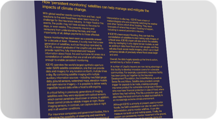 82 83 Lloyd’s Lab Impact Report 83 DA A constellation of eyes alum watching out for disaster ta Cohort 7, 2021 an How ‘persistent monitoring’ satellites can help manage and mitigate the impacts of climate change. ni With global weather events coming thick and fast, rapid Interpretation is also key. ICEYE have a team of d c reactions to 昀椀re and 昀氀ood have never been more of a meteorologists who are constantly watching the weather challenge for the insurance industry. In major 昀氀ood or 昀椀re and other factors which drive 昀氀ooding. They issue ma events, the public may not have access to the area for forecasts of where they expect 昀氀ooding to happen, days, or even weeks. This prevents insurers and including to several parametric insurers. reinsurers from understanding the loss, and most If ICEYE’s team expect 昀氀ooding, they can task the importantly of all, delays payments to those a昀昀ected. os constellation of satellites to start taking radio images of Space monitoring has been seen as a possible answer a 昀氀ood area. ICEYE’s team will also enrich the satellite e for a decade at least. However, it is only now that a new data by overlaying it onto digital terrain models; as well generation of satellites, such as the group operated by as adding in data from 昀氀ood and rain gauges, and they d a ICEYE, a recent graduate of the Lloyd’s Lab; are able to will also track social media imagery, which can in itself provide rapid 昀椀re, fully interpreted and frequent enhance details of precisely where 昀氀ood areas begin e information about 昀氀ood, 昀椀re and hurricane-hit areas via a and end. constellation of satellites that are small and a昀昀ordable Overall, the data hugely speeds up the time to action, lsn enough to enable persistent monitoring. sometimes by a factor of weeks. ICEYE operates the world’s largest synthetic-aperture A number of Lloyd’s insurers are now taking advantage of d radar (SAR) satellite constellation, one that can provide this facility to develop innovative covers for vulnerable data and imagery for any location on Earth, multiple times communities. For example, a parametric insurance facility a day. By combining satellite imaging with multiple has been jointly put together by the Insurance p auxiliary information sources – including river/tidal gauge Development Foundation, the United Nations, as well as data, ground sensors, watershed maps, elevation models Swiss Re and Allianz. Satellite data provided a simple and open-source imagery – it is possible to deliver easily trigger for payouts to be made, creating a grouped oi ingestible hazard data while a 昀氀ood is still ongoing. insurance product for vulnerable rural groups in Ghana, A critical failing in previously generations of imaging who now have 昀椀nancial protection in case of 昀氀ood, where satellites was they were equipped with optical sensors, before they had nothing. This 昀椀lls a protection gap, and which cannot penetrate cloud cover or smoke. In addition, also helps the local community to adapt successfully to n these cannot produce reliable images at night. Radar an increasingly extreme climate environment. imaging sensors, in contrast, can capture data at night Although ICEYE is primarily at present used to monitor t and in all weather conditions. 昀氀oods, the SAR constellation can also be used to track For insurance companies and government bodies, this is deforestation, and to monitor wild昀椀res. It can also unlocking the possibility of observing and reacting to measure ice build-up and melting speed. Finally, the ongoing 昀氀oods as never before. Persistent monitoring of system can persistently monitor movement in the ground, 昀氀oods through the use of SAR satellites contributes to tracking subsidence around, for example, dams and faster, fact-based event response and can enable waste heads from open-cast mines. This data is accurate automated claims noti昀椀cation, support the partial to within millimetres, and can be used to help predict risk automation of claims handling, enhance customer service of collapse in these high-impact environments – critical and facilitate rapid loss assessment and more accurate both for insurer and for insured. reserving. The depth of data provided can also go further, Space technology is beginning to enable innovative and support solutions to provide safety nets for activities within insurance and around the management of communities at risk of 昀氀ood. climate change, that enables better recovery from catastrophes than has even been thought possible. © Lloyd’s