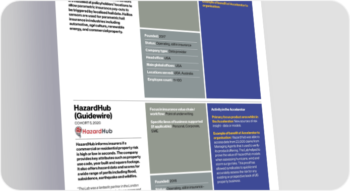 88 Data and models – Alumni profiles Lloyd’s Lab Impact Report 89 Hailios Focus in insurance value chain/ Activity in the Accelerator ICEYE Focus in insurance value chain/ Activity in the Accelerator COHORT , workflow: Loss modelling & analytics, COHORT , workflow: Loss modelling & analytics, Claims Primary focus product area whilst in Claims Primary focus product area whilst in the Accelerator: New sources of risk the Accelerator: Improving claims Specific lines of business supported insight - data or models, Improving Specific lines of business supported process (if applicable): Corporate, SME, claims process (if applicable): Personal, Corporate, Speciality, Reinsurance SME, Speciality, Reinsurance, Example of benefit of Accelerator to Example of benefit of Accelerator to Government organisation: ICEYE worked in the Hailios has created compact sensors organisation: ICEYE uses its own constellation of Lab on a solution to help distinguish which detect and analyse hail. Its sensors synthetic aperture radar satellites to between damage caused by water and are installed at policyholders’ locations to provide constant monitoring across the damage caused by wind from a tropical allow parametric insurance pay-outs to world, at any time and in any weather storm. It also got support in building its be triggered by localised hail data. Hailios conditions. The company produces high wildfire damage solution. sensors are used for parametric hail water mark estimates within 24 hours of a insurance in industries including flood, helping insurers to quickly estimate automotive, agriculture, renewable losses and improve the claims process. energy, and commercial property. Founded: 2017 The company is also developing persistent Founded: 2014 monitoring solutions for wildfires and can Status: Operating, still in insurance support parametric insurance products. Status: Operating, still in insurance Company type: Data provider “Taking part in Lloyds Lab gave ICEYE superb Company type: Data provider Head oce: USA exposure to the market and the opportunity to Head oce: Finland gain hugely valuable insight into the way in which Main global oces: USA market participants can get value from utilising Main global oces: Finland our unique Nat Cat solutions. We’re finding Locations served: USA, Australia continued involvement highly beneficial.” Locations served: Global Stephen Lathrope, Global Head of Insurance Employee count: 11-100 Employee count: 201-500 HazardHub Focus in insurance value chain/ Activity in the Accelerator Insurdata Focus in insurance value chain/ Activity in the Accelerator (Guidewire) workflow: Point of underwriting COHORT , workflow: Point of underwriting Primary focus product area whilst in Primary focus product area whilst in COHORT , Specific lines of business supported the Accelerator: New sources of risk Specific lines of business supported the Accelerator: New sources of risk Personal, Corporate, (if applicable): (if applicable): insight - data or models insight - data or models SME Example of benefit of Accelerator to Example of benefit of Accelerator to organisation: HazardHub was able to organisation: After their time in the HazardHub informs insurers if a access data from 23,000 claims from Insurdata provides insurers and cohort, Insurdata was acquired by commercial or residential property risk Managing Agents that it used to verify reinsurers with building-level location Big Ticket and continues to act as a is high or low in seconds. The company its product oering. The Lab helped to data and geocoding services. wholly-owned subsidiary. Earlier this provides key attributes such as property prove the value of HazardHub models The company specialises in high- year, Big Ticket launched their digital use code, year built and square footage. when assessing hurricane, wind and resolution, peril-specific exposure infrastructure for commercial insurance It also offers hazard data and scores for storm surge risks. This proof has and property risk data to support using Insurdata’s technology as a a wide range of perils including flood, allowed syndicates to quickly and pricing, underwriting and portfolio foundation. subsidence, earthquake and wildfire. accurately assess the risk for any management. Founded: 2016 existing or prospective book of US Founded: 2017 “The Lab was a fantastic partner in the London property business. market and super-accelerated our success and Status: Operating, still in insurance - Status: Acquired by Big Ticket (in 2022 eventual exit!” division of Guidewire Software, Inc - inferred) Bob Frady, Vice President Company type: Data provider Company type: Data provider Head oce: North America Head oce: North America Main global oces: USA Main global oces: USA Locations served: USA Locations served: Global Employee count: 1001+ Employee count: 1-10 © Lloyd’s