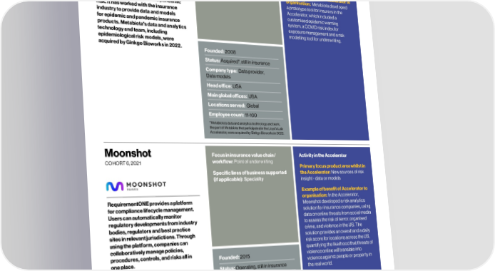 94 Data and models – Alumni profiles Lloyd’s Lab Impact Report 95 Metabiota Focus in insurance value chain/ Activity in the Accelerator Oasis Loss Modelling Focus in insurance value chain/ Activity in the Accelerator COHORT , workflow: Point of underwriting Framework (LMF) workflow: Point of underwriting, Loss Primary focus product area whilst in modelling & analytics Primary focus product area whilst in Specific lines of business supported the Accelerator: New sources of risk COHORT , the Accelerator: Data, product & (if applicable): Speciality insight - data or models Specific lines of business supported service consolidator (if applicable): Example of benefit of Accelerator to Example of benefit of Accelerator to organisation: Metabiota developed organisation: The Lab increased the Metabiota is focused on quantifying a prototype tool for insurers in the Oasis provides an open-source platform profile of Oasis and its objectives in the and mitigating epidemic and pandemic Accelerator, which included a for developing, deploying and executing London Market. It helped to promote risk. It has worked with the insurance customised epidemic warning catastrophe models. It was created to Open Data Standards that Oasis industry to provide data and models system, a COVID risk index for increase the model choice for the (re) curates on behalf of the insurance for epidemic and pandemic insurance exposure management and a risk insurance industry, whilst democratising industry. The Open Results Data products. Metabiota's data and analytics modelling tool for underwriting. risk for developing countries. Oasis’ other initiative that was developed and technology and team, including aims include reducing costs to the released during Cohort 3 is being epidemiological risk models, were industry, increasing innovation, implemented into many organisations. acquired by Ginkgo Bioworks in 2022. Founded: 2008 maintaining open data standards, Founded: 2012 supporting academics, and reducing the Status: Acquired*, still in insurance barriers to entry for firms that want to get Status: Operating, still in insurance Company type: Data provider, their models used within insurance. Company type: Other Data models “The Lab gets your right to the heart of the London market, talking to many of the right people. For us Head oce: United Kingdom Head oce: USA promoting open standards it gave us a great lift.” Main global oces: United Kingdom Main global oces: USA Dickie Whittaker, Chief Executive Officer Locations served: Global Locations served: Global Employee count: 11-100 Employee count: 11-100 *Metabiota’s data and analytics technology and team, the part of Metabiota that participated in the Lloyd’s Lab Accelerator, were acquired by Ginkgo Bioworks in 2022. Moonshot Focus in insurance value chain/ Activity in the Accelerator Orca AI Focus in insurance value chain/ Activity in the Accelerator COHORT , workflow: Point of underwriting COHORT , workflow: Risk mitigation, Primary focus product area whilst in Compliance & regulatory support Primary focus product area whilst in Specific lines of business supported the Accelerator: New sources of risk the Accelerator: New sources of risk (if applicable): Speciality insight - data or models Specific lines of business supported insight - data or models (if applicable): Speciality Example of benefit of Accelerator to Example of benefit of Accelerator to organisation: In the Accelerator, organisation: Since their time in the RequirementONE provides a platform Moonshot developed a risk analytics Orca AI is used to track vessel activity Lab, Orca AI have partnered with a for compliance lifecycle management. solution for insurance companies, using and risks. One of Orca AI’s products, number of investors and launched Users can automatically monitor data on online threats from social media SeaPod, gathers and tracks targets another product, Fleet View, which regulatory developments from industry to assess the risk of terror, organised such as oceanic wildlife, buoys and aims to collate data from millions of bodies, regulators and best practice crime, and violence in the US. The fishing boats that may pose a risk to nautical miles to provide fleet sites in relevant jurisdictions. Through solution provides an overall and a daily ships. Its other product, FleetView, managers with information about using the platform, companies can risk score for locations across the US, can be used by fleet managers to their vessels and feedback to collaboratively manage policies, quantifying the likelihood that threats of monitor the operations of a shipping their crews. procedures, controls, and risks all in Founded: 2015 violence online will translate into fleet. It provides a bespoke risk score Founded: 2018 one place. violence against people or property in to each ship and recommendations Status: Operating, still in insurance the real world. on how to reduce this risk. Status: Operating, still in insurance “We found that Lloyds Market was a very good fit with our mission – to ‘help companies action Company type: Data provider Company type: Data provider regulatory change’. Our regulatory change management solution could quickly be Head oce: United Kingdom Head oce: Israel adapted to individual needs of Lloyds Market Main global oces: United Kingdom, Main global oces: Eastern participants to track and action relevant regulatory developments.” USA Mediterranean Helen Dann, Co-Founder Locations served: Global Locations served: Global and Chief Customer Officer Employee count: 11-100 Employee count: 11-100 © Lloyd’s