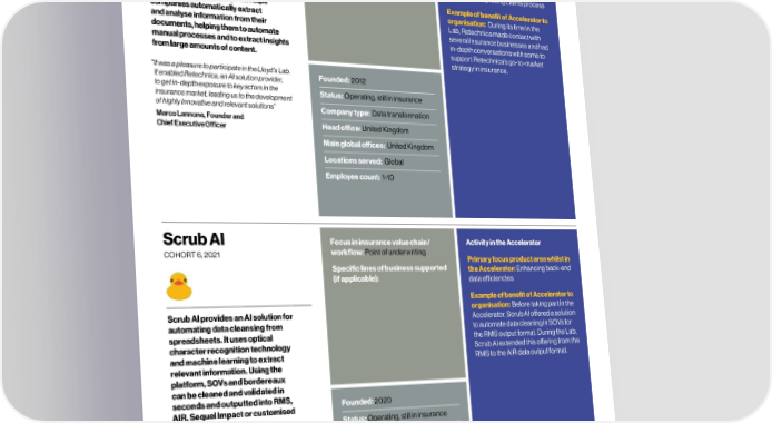 80Process Optimisation – Alumni profilesLloyd’s Lab Impact Report 81 Phinsys Focus in insurance value chain/Activity in the AcceleratorRetechnica Focus in insurance value chain/ Activity in the Accelerator COHORT , workflow: Compliance & regulatory COHORT , workflow: Point of underwriting, support Primary focus product area whilst in Claims Primary focus product area whilst in the Accelerator: Ancillary, the Accelerator: Improving policy and Specific lines of business supported accountancy and regulatory Specific lines of business supported claims admin, Improving UW tools and (if applicable): Corporatecompliance services (if applicable): processes, Enhancing back-end data eciencies, Improving claims process Example of benefit of Accelerator to Phinsys has built a platform of software organisation: As part of its time in the Retechnica is an artificial intelligence Example of benefit of Accelerator to tools to optimise and automate the Accelerator, Phinsys created three new company. Its product Ingenia helps organisation: During its time in the finance function of insurance businesses, full suite proof-of-concepts. It also companies automatically extract Lab, Retechnica made contact with improving their financial accounting, worked to ensure that its product and analyse information from their several insurance businesses and had regulatory reporting and analytical worked in line with the Lloyd’s Market documents, helping them to automate in-depth conversations with some to processes. The company works with a Data Collections (MDC) programme, manual processes and to extract insights support Retechnica’s go-to-market wide range of insurance organisations which aims to improve the ways in from large amounts of content. strategy in insurance. across the UK, Europe, US, Bermuda, which Lloyd’s handles data. As well as and Lloyd’s insurance markets.Founded: 2010this, Phinsys was introduced to many “It was a pleasure to participate in the Lloyd's Lab. Founded: 2012 managing agents it had not previously It enabled Retechnica, an AI solution provider, “ Our time in the Lab provided invaluable Status: Operating, still in insuranceworked with. It also conducted to get in-depth exposure to key actors in the Status: Operating, still in insurance exposure to the market for our finance insurance market, leading us to the development automation platform and revealed the Company type: Data transformation, research to show that the company’s of highly innovative and relevant solutions”Company type: Data transformation extent of the challenge faced by all Administration systemsolution saves on average 500 hours a Marco Lannone, Founder and Lloyd’s syndicates in dealing with high year in completing Lloyd’s Quarterly Chief Executive Officer Head oce: United Kingdom operating costs and legacy systems that Head oce: United KingdomReturns. hamper future growth and profitability” Main global oces: United Kingdom Main global oces: United Kingdom Stuart Conibear, Chief Commercial Officer Locations served: Global Locations served: USA, Europe, United Kingdom Employee count: 1-10 Employee count: 11-100 RequirementONE Focus in insurance value chain/Activity in the AcceleratorScrub AI Focus in insurance value chain/ Activity in the Accelerator COHORT , workflow: Compliance & regulatory COHORT , workflow: Point of underwriting support Primary focus product area whilst in Primary focus product area whilst in the Accelerator: Ancillary, Specific lines of business supported the Accelerator: Enhancing back-end Specific lines of business supported accountancy and regulatory (if applicable): data eciencies (if applicable): compliance services Example of benefit of Accelerator to Example of benefit of Accelerator to organisation: Before taking part in the RequirementONE provides a platform organisation: RequirementONE Scrub AI provides an AI solution for Accelerator, Scrub AI oered a solution for compliance lifecycle management. gained a greater understanding of the automating data cleansing from to automate data cleaning in SOVs for Users can automatically monitor Lloyd’s of London ecosystem.spreadsheets. It uses optical the RMS output format. During the Lab, regulatory developments from industry character recognition technology Scrub AI extended this oering from the bodies, regulators and best practice and machine learning to extract RMS to the AIR data output format. sites in relevant jurisdictions. Through relevant information. Using the using the platform, companies can platform, SOVs and bordereaux collaboratively manage policies, can be cleaned and validated in procedures, controls, and risks all in Founded: 2015seconds and outputted into RMS, Founded: 2020 one place. AIR, Sequel Impact or customised Status: Operating, still in insuranceformats. Status: Operating, still in insurance “We found that Lloyds Market was a very good fit with our mission – to ‘help companies action Company type: Administration systemCompany type: Data transformation regulatory change’. Our regulatory change management solution could quickly be Head oce: United Kingdom Head oce: United Kingdom adapted to individual needs of Lloyds Market Main global oces: United KingdomMain global oces: United Kingdom participants to track and action relevant regulatory developments.”Locations served: Global Locations served: Global Helen Dann, Co-Founder and Chief Customer OfficerEmployee count: 1-10 Employee count: 1-10 © Lloyd’s