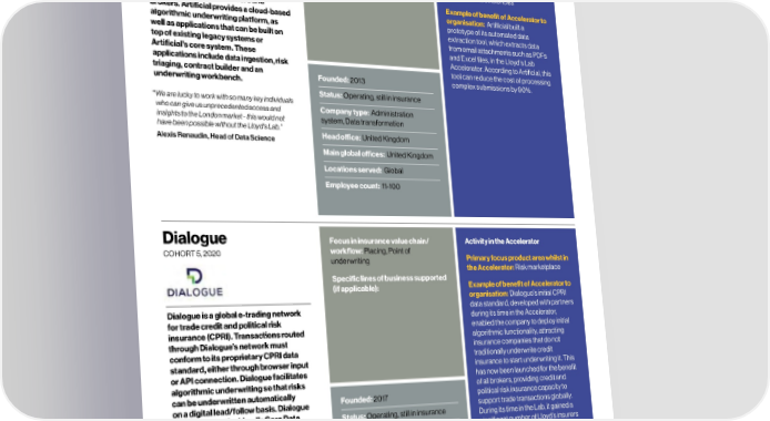 48 Distribution – Alumni profiles Lloyd’s Lab Impact Report 49 Artificial Labs Focus in insurance value chain/ Activity in the Accelerator iCede Focus in insurance value chain/ Activity in the Accelerator COHORT , workflow: Point of underwriting COHORT , , workflow: Placing Primary focus product area whilst in Primary focus product area whilst in Specific lines of business supported the Accelerator: Improving UW tools Specific lines of business supported the Accelerator: Ancillary, (if applicable): Corporate, SME, and processes, New sources of risk (if applicable): accountancy and regulatory Speciality insight - data or models, Enhancing compliance services back-end data eciencies Example of benefit of Accelerator to Artificial builds technology and software Example of benefit of Accelerator to iCede has been designed to manage the organisation: Despite engagement of tools for commercial insurers and organisation: Artificial built a end-to-end process for ‘fronting insurers’ mentors and interest of several brokers. Artificial provides a cloud-based prototype of its automated data to issue a policy in their local market, syndicates, iCede encountered various algorithmic underwriting platform, as extraction tool, which extracts data based on the instructions and price set by challenges during the Lab programme well as applications that can be built on from email attachments such as PDFs another insurer. Policies like these are and did not achieve the desired top of existing legacy systems or and Excel files, in the Lloyd's Lab designed to cover an exposure in a market outcome. Artificial’s core system. These Accelerator. According to Artificial, this where the insurer issuing instructions is applications include data ingestion, risk tool can reduce the cost of processing not permitted to write business. This triaging, contract builder and an Founded: 2013 complex submissions by 90%. supports the processes for arranging Founded: 2012 underwriting workbench. multinational insurance programmes Status: Operating, still in insurance aected by dierent laws and languages. Status: Operating, still in insurance “ We are lucky to work with so many key individuals who can give us unprecedented access and Company type: Administration Company type: Administration system insights to the London market - this would not system, Data transformation have been possible without the Lloyd's Lab.” Head oce: United Kingdom Alexis Renaudin, Head of Data Science Head oce: United Kingdom Main global oces: United Kingdom Main global oces: United Kingdom Locations served: Global Locations served: Global Employee count: 1-10 Employee count: 11-100 Dialogue Focus in insurance value chain/ Activity in the Accelerator Inclusivity Solutions Focus in insurance value chain/ Activity in the Accelerator COHORT , workflow: Placing, Point of COHORT , workflow: Policy admin system, Claims underwriting Primary focus product area whilst in Primary focus product area whilst in the Accelerator: Risk marketplace Specific lines of business supported the Accelerator: Increasing access to Specific lines of business supported (if applicable): Personal, Gig/ insurance (if applicable): Example of benefit of Accelerator to Freelance, SME, Speciality organisation: Dialogue’s initial CPRI Example of benefit of Accelerator to Dialogue is a global e-trading network data standard, developed with partners organisation: Lloyd’s Lab supported during its time in the Accelerator, Inclusivity Solutions is an embedded Inclusivity Solutions’ ideas around for trade credit and political risk enabled the company to deploy initial insurance technology company enabled micro-SME products, which have insurance (CPRI). Transactions routed algorithmic functionality, attracting by an open API-based core policy and launched in Zambia with FNB and through Dialogue’s network must insurance companies that do not claims platforms for consumer, group fintech Instafinance, with many more to conform to its proprietary CPRI data traditionally underwrite credit and micro-SME insurance products in come. During its time in the Lab it standard, either through browser input insurance to start underwriting it. This emerging markets. It works with secured over $1.5 million in funding from or API connection. Dialogue facilitates has now been launched for the benefit insurers and distribution partners such existing investors. algorithmic underwriting so that risks of all brokers, providing credit and as banks, mobile network operators and can be underwritten automatically political risk insurance capacity to fintechs to help deliver simple digital on a digital lead/follow basis. Dialogue Founded: 2017 insurance products such as life, health Founded: 2015 also supports the Lloyd’s Core Data support trade transactions globally. Status: Operating, still in insurance During its time in the Lab, it gained a and property insurance. Status: Operating, still in insurance Record (CDR). significant number of Lloyd’s insurers Company type: Risk exchange as clients. Company type: Administration system “The Lloyd's Lab program was instrumental in Dialogue's development of the world's first lead/ Head oce: United Kingdom Head oce: South Africa follow engine in credit and political risk. This Main global oces: United Kingdom Main global oces: South Africa collaboration led to pioneering innovation, unifying terminology, and enhancing market efficiency.” Locations served: United Kingdom Locations served: Africa Ben Heaney, Founder and Chief Executive Officer Employee count: 1-10 Employee count: 11-100 © Lloyd’s © Lloyd’s