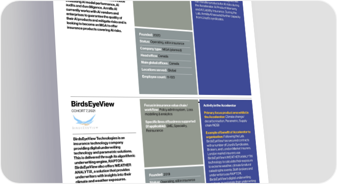 30 New products/ MGA – Alumni profiles Lloyd’s Lab Impact Report 31 Armilla AI Focus in insurance value chain/ Activity in the Accelerator Blink Parametric Focus in insurance value chain/ Activity in the Accelerator COHORT , workflow: Point of underwriting COHORT , workflow: Point of underwriting, Policy Primary focus product area whilst in admin system, Claims Primary focus product area whilst in Specific lines of business supported the Accelerator: AI the Accelerator: Improving UW tools (if applicable): Speciality Specific lines of business supported and processes, Improving claims Example of benefit of Accelerator to (if applicable): Personal, SME process Armilla AI designed two organisation: risk transfer products for AI risks during Example of benefit of Accelerator to Armilla AI focuses on AI assurance and the Accelerator: AI Product Warranty Blink Parametric works with insurers, organisation: In the Lloyd's Lab risk management. Its capabilities include and AI Liability Insurance. During the brands and anity groups to provide Accelerator, Blink Parametric evaluating AI model performance, AI Lab, Armilla AI secured further capacity parametric insurance solutions to developed its "Blink Interruption" audits and due diligence. Armilla AI from Lloyd’s syndicates. consumers worldwide. It provides solution for non-damage business currently works with AI vendors and customisable white-label software interruption (NDBI). Blink Interruption is enterprises to guarantee the quality of solutions enabling companies to embed a white-label parametric insurance their AI products and mitigate risks and is parametric insurance products into their product that uses open banking to looking to become an MGA to oer brand’s propositions, delivering real-time provide small and medium-sized insurance products covering AI risks. Founded: 2020 digital assistance to consumers in their Founded: 2016 businesses with fast liquidity after a time of need. Blink Parametric’s core hurricane. Blink Parametric estimates Status: Operating, still in insurance specialism is travel insurance, where it Status: Operating, still in insurance that the product can reduce average provides real-time solutions for flight claim process time by 95%. Company type: MGA (planned) disruption and lost or delayed luggage. Company type: Administration system Head oce: Canada Head oce: Ireland “ We collaborated with some of the world’s best Main global oces: Canada minds in insurance innovation. Lloyd’s market Main global oces: Ireland, access was invaluable, offering expert mentors, United Kingdom Locations served: Global rich data modelling and testing forums within a Programme that has a global reach. Fresh, Locations served: Global Employee count: 11-100 challenging, value-focussed, Lloyd’s Lab is essential to the evolution of insurance.” Employee count: 11-100 Sid Mouncey, Chief Executive Ocer Focus in insurance value chain/ Activity in the Accelerator Focus in insurance value chain/ Activity in the Accelerator BirdsEyeView Technologies Boxx Insurance COHORT , workflow: Policy admin system, Loss COHORT , workflow: Risk mitigation, Point of modelling & analytics Primary focus product area whilst in underwriting Primary focus product area whilst in the Accelerator: Climate change/ the Accelerator: Cyber, SMEs Specific lines of business supported decarbonisation, Parametric, Supply Specific lines of business supported (if applicable): SME, Speciality, chain/NDBI (if applicable): Personal, SME Example of benefit of Accelerator to Reinsurance organisation: The Lab was a great Example of benefit of Accelerator to credential that has contributed to BirdsEyeView Technologies is an organisation: Following the Lab, BOXX Insurance (BOXX) is an MGA BOXX’s ability to expand its binder insurance technology company BirdsEyeView has secured contracts providing cyber insurance. Its flagship in Canada and secure London providing digital underwriting with a number of Lloyd’s Syndicates, product, Cyberboxx focuses on cyber Market capacity for its entry into technology and parametric solutions. Brokers, and London Market Insurers. risk management solutions for small and the US market. its time in the Lab This is delivered through its algorithmic London market insurers use medium-sized enterprises (SMEs) and helped form the idea of the All-in-one underwriting engine, RAPTOR. BirdsEyeView’s WEATHER ANALYTIX individuals. It includes threat prediction, BOXX Protect App which combines BirdsEyeView also oers WEATHER technology to calculate their exposure attack prevention and response BOXX’s risk management tools ANALYTIX, a solution that provides to extreme weather, climate & natural services. BOXX also provides insurers, and incident response, making it underwriters with insights into their Founded: 2019 catastrophe events. Both brokers and anity partners and larger industry Founded: 2018 easier for individuals and SMEs to climate and weather exposures. underwriters use RAPTOR, organisations with white-label solutions stay ahead of cyber threats. Status: Operating, still in insurance BirdsEyeView’s digital underwriting for cyber protection and insurance Status: Operating, still in insurance platform, to automate their underwriting products. Company type: Data models, and policy administration processes. Company type: MGA Administration system “ Participating in the 4th Cohort of the Lloyd’s Lab was pivotal for BOXX in helping us further Head oce: Canada Head oce: United Kingdom refine our proposition, with fantastic support Main global oces: Canada Main global oces: United Kingdom from our mentors in the Lab on how to make the proposition simple and easily accessible to Locations served: Global Locations served: Global address the needs of the market.” Dominic Steptoe, Global Chief Product Ocer Employee count: 11-100 Employee count: 1-10 © Lloyd’s © Lloyd’s