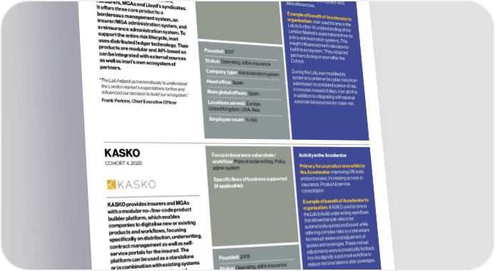 76 Process Optimisation – Alumni profiles Lloyd’s Lab Impact Report 77 Inari Focus in insurance value chain/ Activity in the Accelerator Optalitix Focus in insurance value chain/ Activity in the Accelerator COHORT , workflow: Point of underwriting, Policy COHORT , workflow: Point of underwriting, admin system, Claims, Compliance & Primary focus product area whilst in Compliance & regulatory support Primary focus product area whilst in regulatory support the Accelerator: Improving policy and the Accelerator: Improving UW tools claims admin I Improving UW tools and Specific lines of business supported and processes, Enhancing back-end Specific lines of business supported processes I Data, product & service (if applicable): data eciencies (if applicable): Corporate, SME, consolidator I Enhancing back-end Speciality data eciencies Example of benefit of Accelerator to inari provides a cloud-based policy Optalitix improves underwriting and organisation: Optalitix created a administration system for insurers, Example of benefit of Accelerator to risk management for insurers. Its proof-of-concept version of their reinsurers, MGAs and Lloyd's syndicates. organisation: inari used its time in the operational products include an data collection product. This product It oers three core products: a Lab to further its understanding of the underwriting workbench that allows aimed to reduce the time taken by bordereaux management system, an London Market’s expectations from its users to manage risk more eectively insurers to report on and share insurer/MGA administration system, and policy administration systems. This and a data analytics tool for improving catastrophe data. After the Accelerator, a reinsurance administration system. To insight influenced inari’s decision to data accuracy and understanding risk. Optalitix was authorised by Lloyd’s to support the entire risk lifecycle, inari build its ecosystem. They obtained Its products are hosted on a no-code create a full-build version of this in uses distributed ledger technology. Their Founded: 2017 partners during or soon after the administration system that can be Founded: 2013 October 2020, going on to help products are modular and API-based so Cohort. integrated with any other system. Lloyd’s save 13,000 hours in data can be integrated with external sources Status: Operating, still in insurance Optalitix allows users to host any Status: Operating, still in insurance administration time. Its platform has as well as inari’s own ecosystem of During the Lab, inari modified its existing Excel, Python or R model in reported on over $6bn of catastrophe partners. Company type: Administration system systems to underwrite cyber risks from their products and connect using Company type: Administration claims globally for 187 insurers, submission to post bind a piece of risk, APIs and web forms. system, Software provider coverholders and TPAs helping to Head oce: Spain “ The Lab helped us tremendously to understand in minutes instead of days. inari did this Head oce: United Kingdom improve post-catastrophe recovery. the London market's expectations further and Main global oces: Spain in addition to integrating with several influenced our decision to build our ecosystem.” external data sources for cyber risk. Main global oces: United Kingdom Frank Perkins, Chief Executive Officer Locations served: Europe, United Kingdom, USA, Asia Locations served: Global Employee count: 11-100 Employee count: 11-100 KASKO Focus in insurance value chain/ Activity in the Accelerator Persefoni Focus in insurance value chain/ Activity in the Accelerator COHORT , workflow: Point of underwriting, Policy COHORT , workflow: Compliance & regulatory admin system Primary focus product area whilst in Primary focus product area whilst in the Accelerator: Improving UW tools support the Accelerator: Ancillary, Specific lines of business supported and processes, Increasing access to Specific lines of business supported accountancy and regulatory (if applicable): insurance, Product & service (if applicable): compliance services consolidator Example of benefit of Accelerator to KASKO provides insurers and MGAs Example of benefit of Accelerator to Persefoni's software helps companies organisation: Persefoni came into the with a modular no-/low-code product organisation: KASKO used its time in and financial institutions to meet Lab with a mission to help the Lloyd’s builder platform, which enables the Lab to build underwriting workflows stakeholder and regulatory climate market to start working towards its goal companies to digitalise new or existing that allowed simple risks to be disclosure requirements. The of net zero underwriting by 2050. At the products and workflows, focusing automatically quoted and bound, while company’s software allows clients beginning of the Lab, Persefoni had a lot specifically on distribution, underwriting, referring complex risks to underwriters to measure their carbon footprint, of engagement from their mentors and contract management as well as self- for manual review and adjustment of report on it and track their emissions a promising discussion about the service portals for the insured. The quotes and coverages. These manual reduction progress. Persefoni’s carbon accounting needs of the Lloyd’s platform can be used as a standalone Founded: 2015 adjustments were automatically fed back clients are within the private equity, Founded: 2020 market and the upcoming PCAF or in combination with existing systems into the digitally supported workflow to banking and insurance industries. guidelines for carbon accounting and such as policy administration and Status: Operating, still in insurance reduce the time taken to alter coverages. Status: Operating, still in insurance reporting in the insurance industry. claims solutions. “We're really proud of the traction we achieved Some initial progress was made in Company type: Administration system
