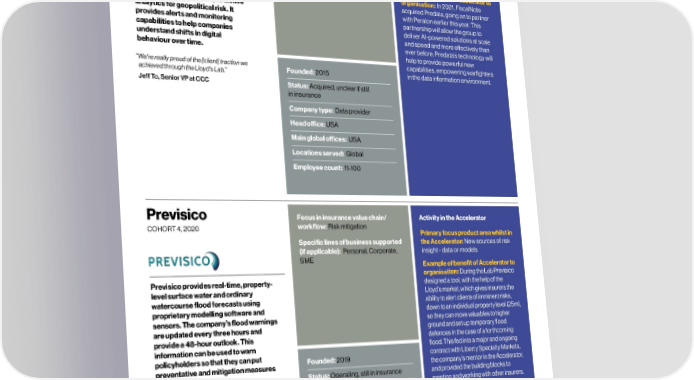 96Data and models – Alumni profilesLloyd’s Lab Impact Report 97 PolArctic Focus in insurance value chain/Activity in the AcceleratorPredata Focus in insurance value chain/ Activity in the Accelerator COHORT , workflow: Point of underwriting, COHORT , workflow: Loss modelling & analytics Compliance & regulatory support Primary focus product area whilst in Primary focus product area whilst in the Accelerator: New sources of risk Specific lines of business supported the Accelerator: New sources of risk Specific lines of business supported insight - data or models (if applicable): Speciality insight - data or models (if applicable): Speciality, Reinsurance, GovernmentExample of benefit of Accelerator to Example of benefit of Accelerator to organisation: PolArctic gained access organisation: In 2021, FiscalNote PolArctic is an oceanographic and data to a range of mentors, helping to Predata analyses online activity acquired Predata, going on to partner science company with a focus on fine-tune the organisation’s oering. and web trac to create predictive with Peraton earlier this year. This creating products for the Arctic. The PolArctic was then able to present its analytics for geopolitical risk. It partnership will allow the group to company identifies and creates solutions solutions to the Lloyd's Market provides alerts and monitoring deliver AI-powered solutions at scale to business and policy questions about Association Navigating Limits Ice capabilities to help companies and speed and more eectively than the Arctic through the use of artificial committee, which led to an opportunity understand shifts in digital ever before. Predata’s technology will intelligence and machine learning for a trial with the committee. behaviour over time. help to provide powerful new techniques, allowing customers to plan capabilities, empowering warfighters for future Arctic maritime activities.Founded: 2020As maritime trac intensifies in the “We're really proud of the [client] traction we Founded: 2015in the data information environment. Arctic, the potential for accidents and achieved through the Lloyd's Lab.” “ Our time in the Lab provided invaluable Status: Operating, still in insurancedamages increases, exposing Jeff To, Senior VP at CCCStatus: Acquired, unclear if still exposure to the market for our finance reinsurers to greater risk as ship fleets in insurance automation platform and revealed the Company type: Data providercould be frozen into a region. By extent of the challenge faced by all incorporating PolArctic's data, Company type: Data provider Lloyd’s syndicates in dealing with high Head oce: United Kingdom operating costs and legacy systems that reinsurers can accurately assess the Head oce: USA hamper future growth and profitability”Main global oces: United Kingdompotential exposure and losses associated with the increased shipping Main global oces: USA Stuart Conibear, Chief Commercial OfficerLocations served: Arcticactivities across a portfolio. Locations served: Global Employee count: 1-10 Employee count: 11-100 Praedicat Focus in insurance value chain/Activity in the AcceleratorPrevisico Focus in insurance value chain/ Activity in the Accelerator COHORT , AND COHORT , workflow: Risk mitigation, Point of COHORT , workflow: Risk mitigation underwriting, Loss modelling & Primary focus product area whilst in Primary focus product area whilst in analytics the Accelerator: New sources of risk Specific lines of business supported the Accelerator: New sources of risk insight - data or models (if applicable): Personal, Corporate, insight - data or models Specific lines of business supported SME Example of benefit of Accelerator to (if applicable): CorporateExample of benefit of Accelerator to organisation: organisation: During the Lab Previsico In Cohort 3, Praedicat Praedicat uses scientific research, created a new insurance product called Previsico provides real-time, property- designed a tool, with the help of the advanced data analytics and modelling Hundreds, a casualty product covering level surface water and ordinary Lloyd’s market, which gives insurers the techniques to help (re)insurers better risk on a named peril basis. This includes watercourse flood forecasts using ability to alert clients of imminent risks, understand and manage emerging risks. new technologies such as 5G, proprietary modelling software and down to an individual property level (25m), The idea was born out of a research nanotechnology and chemicals used in sensors. The company’s flood warnings so they can move valuables to higher and development project between manufacturing and agriculture. The are updated every three hours and ground and set up temporary flood RAND and RMS. Praedicat uses data product is designed to cover general provide a 48-hour outlook. This defences in the case of a forthcoming science and artificial intelligence liability and D&O around the same liability information can be used to warn flood. This fed into a major and ongoing to build a probabilistic liability Founded: 2012events, which is a common coverage policyholders so that they can put Founded: 2019 contract with Liberty Specialty Markets, catastrophe model and risk products gap. It provides underwriters with data preventative and mitigation measures the company’s mentor in the Accelerator, for some of the world’s largest Status: Operating, still in insurancethat allows them to assess exposures in place to help limit losses.Status: Operating, still in insuranceand provided the building blocks to insurers and corporations.and control aggregation risks. meeting and working with other insurers. Company type: Data provider, “With flood’s global risk increasing exponentially, Company type: Data provider Data modelsdue to climate change and urbanisation, Previsico Using historic Lloyd’s loss data Previsico “Being part of the Accelerator definitely enabled us In cohort 5, Praedicat developed a suite Head oc