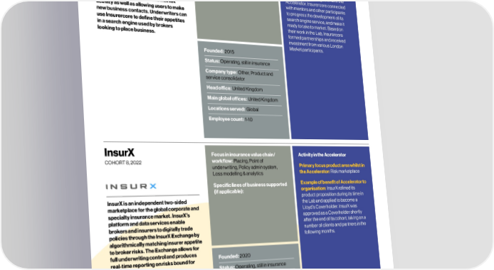 52 Distribution – Alumni profiles 52 Lloyd’s Lab Impact Report 53 Insurercore Focus in insurance value chain/ Activity in the Accelerator Kayna Focus in insurance value chain/ Activity in the Accelerator COHORT , workflow: Placing COHORT , workflow: Point of underwriting Primary focus product area whilst in Primary focus product area whilst in Specific lines of business supported the Accelerator: Risk marketplace Specific lines of business supported the Accelerator: Increasing access to (if applicable): (if applicable): SME insurance Example of benefit of Accelerator to During its time in the Example of benefit of Accelerator to organisation: Accelerator, Insurercore connected organisation: Kayna originally planned Insurercore is an insurance networking with mentors and other participants Kayna provides technology to enable to operate as a regulated insurance service, it provides news and market to progress the development of its insurers and brokers to integrate with entity providing coverage to SMEs. activity as well as allowing users to make search engine service, and make it vertical SaaS platforms to oer embedded Based on work done with Lloyd's new business contacts. Underwriters can ready to take to market. Based on insurance to SMEs. Vertical SaaS market participants during the Lab, it use Insurercore to define their appetites their work in the Lab, Insurercore platforms provide various software decided to pivot its business model to in a search engine used by brokers formed partnerships and received services tailored to a specific industry. become a technology provider, looking to place business. investment from various London Kayna enables insurers to price coverage enabling any insurer or broker to embed Market participants. and update policies based on improved insurance coverage in vertical SaaS Founded: 2015 information about an SME's business Founded: 2021 platforms. operations and changes to those Status: Operating, still in insurance operations. Status: Operating, still in insurance Company type: Other, Product and “Kayna's embedded orchestration layer is the ideal Company type: Administration system service consolidator solution for Lloyd’s coverholders who want to move quickly with no capital expenditure into the Head oce: Ireland Head oce: United Kingdom rapidly growing vertical SaaS sector. Our software Main global oces: Ireland Main global oces: United Kingdom platform partners love the hybrid solution of great fast tech from Kayna and the incredible Locations served: United Kingdom, Locations served: Global experience of the Lloyd’s coverholders.” USA Paul Prendergast, Chief Executive Officer Employee count: 1-10 and Co-Founder Employee count: 1-10 InsurX Focus in insurance value chain/ Activity in the Accelerator Layr Focus in insurance value chain/ Activity in the Accelerator COHORT , workflow: Placing, Point of COHORT , workflow: Placing, Point of underwriting underwriting, Policy admin system, Primary focus product area whilst in Primary focus product area whilst in Loss modelling & analytics the Accelerator: Risk marketplace Specific lines of business supported the Accelerator: Improving policy and (if applicable): Gig/Freelance, SME claims admin, Improving UW tools and Specific lines of business supported Example of benefit of Accelerator to processes, Increasing access to (if applicable): organisation: InsurX refined its insurance product proposition during its time in InsurX is an independent two-sided the Lab and applied to become a The Layr platform automates and Example of benefit of Accelerator to marketplace for the global corporate and Lloyd’s Coverholder. InsurX was digitizes manual, day-to-day tasks such organisation: Layr worked with specialty insurance market. InsurX’s approved as a Coverholder shortly as proposal generation for small, Lloyd’s broker partners to design its platform and data services enable after the end of its cohort, taking on a commercial broking departments. It oering for small commercial brokers, brokers and insurers to digitally trade number of clients and partners in the provides three products to brokers: reducing the time taken to underwrite policies through the InsurX Exchange by following months. service automation; digital rating and from weeks to minutes. algorithmically matching insurer appetite placements; access to growth capital. to broker risks. The Exchange allows for Policyholders can access Layr to buy full underwriting control and produces Founded: 2020 and manage their policies without Founded: 2016 real-time reporting on risks bound for needing to speak with their brokers. InsurX’s customers. Status: Operating, still in insurance Status: Operating, still in insurance Company type: Risk exchange Company type: Administration system Head oce: United Kingdom Head oce: North America Main global oces: United Kingdom Main global oces: North America Locations served: United Kingdom , Locations served: Global United States, Australia, New Zealand, India Employee count: 11-100 Employee count: 1-10 © Lloyd’s © Lloyd’s