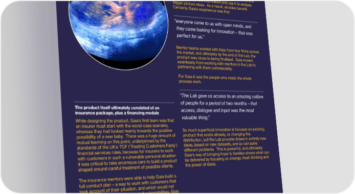 38New products/ MGA Lloyd’s Lab Impact Report 39 New products for new problems For the mentors, some of the learning was basic: Gaia began its 昀椀rst Lab session with anatomy and medical Cohort 6, 2021 workshops, taking the view that if an underwriter did not fully understand the menstrual cycle, they could not understand the Gaia data. Here it can clearly be seen how the Lab process allows underwriters the time and space to study new information and use it to analyse bigger picture ideas. As a result, all sides bene昀椀t. Sometimes the innovation teams that are put together by the Lloyd’s Lab Certainly Gaia’s experience was that are able to tackle some of the most basic human risk and pain points, such as the desire for a family. “ everyone came to us with open minds, and they came looking for innovation – that was Much insurance innovation has involved working on evolving product or distribution channels that exist already, but the Lab process draws in young start-ups with entirely new ideas, based on new datasets, and perfect for us.” which can solve di昀昀erent problems. The story of Gaia embodies this spirit. In the case of the Gaia, the known story was the cost and uncertainty involved in IVF treatment. Mentor teams worked with Gaia from four 昀椀rms across IVF is famously expensive to undertake, which makes the market, and ultimately by the end of the Lab, the the 昀椀nancial planning for couples who face the process product was close to being 昀椀nalised. Gaia moved demanding, exacerbated by the fact that they do not seamlessly from working with mentors in the Lab to know how many cycles of IVF they will have to fund. partnering with them commercially. Many couples have to wait to save up for second and third cycles, which also reduces the chances of For Gaia it was the people who made the whole success: age is an important success factor for the process work. treatment. Gaia’s founders had personally experienced the “The Lab gave us access to an amazing calibre uncertainties of IVF and wanted to create a way to insure against the risk of IVF failure. The team at Gaia of people for a period of two months – that built a model which could predict the chances of The product itself ultimately consisted of an access, dialogue and input was the most success during IVF, and which is able to suggest how insurance package, plus a 昀椀nancing module many cycles would be likely to be needed to achieve valuable thing.” While designing the product, Gaia’s 昀椀rst learn was that that success. an insurer must start with the worst-case scenario, whereas they had looked mainly towards the positive So much super昀椀cial innovation is focused on evolving Gaia had initially raised investor funding on the back of possibility of a new baby. There was a huge amount of product that exists already, or changing the their idea for an insurance product that would manage mutual learning on this point, underpinned by the distribution, but the Lab process draws in entirely new the cost of IVF through regular payment plans and standards of the UK’s TCF (‘Treating Customers Fairly’) ideas, based on new datasets, and so can solve would then pay out should the IVF process fail. 昀椀nancial services rules, because for insurers to work di昀昀erent problems. This is powerful, and ultimately However, to design a working product Gaia had to with customers in such a vulnerable personal situation Gaia’s way of bringing hope to families shows what can partner with an insurer. The Gaia team say that: it was critical to take enormous care to build a product be delivered by focusing on change, fresh thinking and shaped around careful treatment of possible clients. the power of ideas. The insurance mentors were able to help Gaia build a full conduct plan – a way to work with customers that took account of their situation, and which would not “ We joined the Lab to work with the mentors, take advantage of their hopes and vulnerabilities. Gaia were surprised: to transform our conviction about our consumer-facing idea into an insurance “ We thought the most important part would be product. We needed to learn how to make it pricing, but in fact it was conduct planning.” work in terms of shape, conduct and wordings. Through the Lab, we were able to make an insurance proof product, not just a consumer one.” © Lloyd’s