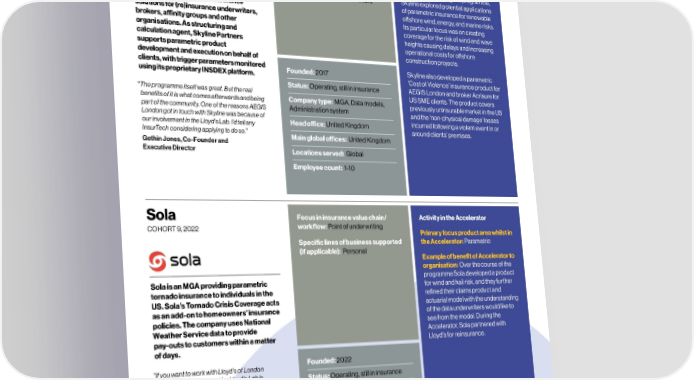 44New products/ MGA – Alumni profilesLloyd’s Lab Impact Report 45 Parametrix Focus in insurance value chain/Activity in the AcceleratorSkyline Partners Focus in insurance value chain/Activity in the Accelerator COHORT , workflow: Placing Point of COHORT , , workflow: Point of underwriting, underwriting, Loss modelling & analytics Primary focus product area whilst in Loss modelling & analytics Primary focus product area whilst in the Accelerator: Cyber, Parametric, the Accelerator: Parametric Specific lines of business supported SMEs, Supply chain/NDBI Specific lines of business supported (if applicable): Corporate, SME, (if applicable): Personal, Gig/ Example of benefit of Accelerator to Example of benefit of Accelerator to During the programme, Speciality, Reinsurance Freelance, Corporate, SME, Speciality, organisation: organisation: The Lloyd's Lab helped Reinsurance, Captive, Government Skyline explored potential applications Parametrix is an MGA and Lloyd’s Parametrix accelerate the launch of its Skyline Partners specialises in creating of parametric insurance for renewable coverholder, underwriting parametric SME insurance product, gain deeper and operating parametric insurance oshore wind, energy, and marine risks. insurance against outages of the cloud, insights on its cloud modelling and solutions for (re)insurance underwriters, Its particular focus was on creating CDNs or e-commerce platforms. Its actuarial analysis, and connect to brokers, anity groups and other coverage for the risk of wind and wave platform automates risk assessment, potential capacity providers. Learning organisations. As structuring and heights causing delays and increasing provides instant quotes, and delivers sessions organised through the Lab calculation agent, Skyline Partners operational costs for oshore payments within days. Parametrix helped the participating and mentoring supports parametric product construction projects. continuously monitors a variety of underwriters to understand new development and execution on behalf of third-party IT services across the globe Founded: 2019parametric coverage options and how clients, with trigger parameters monitored Founded: 2017Skyline also developed a parametric to collect granular data on service to leverage technological capabilities to using its proprietary INSDEX platform.‘Cost of Violence’ insurance product for interruptions which is used to assess risk Status: Operating, still in insuranceallow cloud outage risk coverage, as Status: Operating, still in insuranceAEGIS London and broker Acrisure for and streamline claims payments. It is well as to be introduced to new risk “ The programme itself was great. But the real US SME clients. The product covers backed by capacity from major A-rated Company type: MGAmanagement tools.benefits of it is what comes afterwards and being Company type: MGA, Data models, previously uninsurable market in the US global insurers. part of the community. One of the reasons AEGIS Administration system and the ‘non-physical damage’ losses Head oce: USALondon got in touch with Skyline was because of our involvement in the Lloyd’s Lab. I’d tell any Head oce: United Kingdom incurred following a violent event in or “ We were thrilled to launch our product and work Main global oces: USA, Israel, around clients’ premises. with our partners at Lloyd's."InsurTech considering applying to do so.” United Kingdom, Germany Main global oces: United Kingdom Ori Cohen, Co-Founder and Gethin Jones, Co-Founder and Chief Operating Officer Locations served: USA, Europe, Executive DirectorLocations served: Global Israel, Japan Employee count: 1-10 Employee count: 11-100 ParsylFocus in insurance value chain/Activity in the AcceleratorSola Focus in insurance value chain/ Activity in the Accelerator COHORT , workflow: Point of underwriting, COHORT , workflow: Point of underwriting Claims Primary focus product area whilst in Primary focus product area whilst in the Accelerator: Parametric, Specific lines of business supported the Accelerator: Parametric Specific lines of business supported Supply chain/NDBI (if applicable): Personal (if applicable): Corporate, Speciality Example of benefit of Accelerator to Example of benefit of Accelerator to organisation: Over the course of the Parsyl is a data-powered cargo insurer organisation: The Lab helped Parsyl programme Sola developed a product for essential supply chains in food and develop the new sensor-based Sola is an MGA providing parametric for wind and hail risk, and they further health. Using supply chain data from insurance product for perishable tornado insurance to individuals in the refined their claims product and its sensors and other data sources, marine cargo and secure capacity from US. Sola's Tornado Crisis Coverage acts actuarial model with the understanding Parsyl can more accurately underwrite Ascot, Beazley, CNA Hardy, AXA XL as an add-on to homeowners’ insurance of the data underwriters would like to cargo insurance policies and help and QBE. policies. The company uses National see from the model. During the customers reduce risk. It underwrites Weather Service data to provide Accelerator, Sola partnered with cargo insurance policies globally pay-outs to customers within a matter Lloyd’s for reinsurance. through its managing general of days. underwriter in the US, Lloyd’s Founded: 2018 Founded: 2022 coverholder and Lloyd’s Syndicate “If you want to work with Lloyd's of London 1796. Parsyl leads the Essential Status: Operating, still in insurancesyndicates as a startup, the Lloyd's Lab is Status: Operating, still in insurance Consortium, the first consortium for unquestionably the best place to be.” perishable cargo at Lloyd’s.Company type: MGA, InsurerWesley Pergament, Co-Founder Company type: MGA and Chief Executive Officer Head oce: USA Head oce: North America “Lloyd’s Lab was a pivotal moment in Parsyl’s history. The mentorship and indus