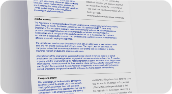 10 Lloyd’s Lab Impact Report 11 L A unique environment lThe Lloyd’s Lab was launched in 2018 to modernise Because the Lloyd’s Lab is a shared asset for the whole market, the individual investments of time and o the commitment required are both reduced, which gives existing market leaders a better way to the insurance industry and harness the opportunities access various avenues of innovation, and a low-cost window to test ideas before committing to them, encouraging participation across the market. ypresented by insurtechs. For five years and 10 Lloyd’s uses its unique leadership position to attract We are lucky to work with so many key dcohorts, the Lloyd’s Lab Accelerator has seen over start-ups into the Lloyd’s Lab and Lloyd’s market individuals who can give us unprecedented 100 insurtechs, start-ups and innovation-focused 昀椀rms input expertise to re昀椀ne start-up products and access and insights to the London market ideas into market-ready customer solutions. In ’ - this would not have been possible without s Lcompanies go through the Lloyd’s Lab and bring their practical terms, the format of the Lloyd’s Lab allows Lloyd’s market 昀椀rms to collaborate, sharing the Lloyd’s Lab. innovative solutions to the market.knowledge in a safe environment. Alexis Renaudin, Head of Data Science, Artificial Labs aThe Lloyd’s Lab embodies an important part of the A global success purpose of Lloyd’s in its creation of a structure and The Accelerator is the most established Lloyd’s Lab programme, attracting insurtechs from across the b – a globe. Every six months the Lloyd’s Lab receives over 200 applications to 昀椀ll 10 places in the physical space in which innovation risk is shared and programme. The successful applicants work with insurers and brokers in the market to develop new products or services that enhance the way the Lloyd’s market does business. Unlike other reduced, in turn allowing start-ups to bring new ideas, Accelerators, which have just a single pool of expertise and set of risk appetites, the Lloyd’s Lab and helping market firms to partner with them to build Accelerator is supported by a market of 93 syndicates and over 300 brokers with deep expertise in di昀昀erent areas with varying risk appetites. out customer solutions. The Accelerator now has over 100 alumni, of which 95% are still growing or have had a successful sale, and 71% are still working with the Lloyd's market. The Lloyd’s Lab is the best places for t a g companies to take their insurance solution or use their existing data and technology to develop insurance relevant products and insurance use cases. A key element of the programme’s success is the wide network of mentors, made up of market practitioners that collectively provide a huge pool of insurance knowledge and expertise. The mentors engaging with the programme help the Accelerator cohort to deliver on the ‘Lab Goals’ they proposed when applying – which are one of the three selection criteria for the Accelerator (along with ‘Product’ and ‘People’). Once accepted, the insurtechs get an opportunity to work closely with the insurance l market, understand their product-market 昀椀t, and gauge the market appetite for their o昀昀ering. a n A long-term project After graduation, all the Accelerator participants As insurers, things have been done the same c become a part of the Lloyd’s Lab alumni network. way for a while. It’s dicult to find pockets The Lloyd’s Lab provides them with extensive marketing and networking opportunities that help the of innovation, and especially hard to find e companies to build a global presence and develop the inspiration to think bigger. Mentoring at relationships with international markets. Lloyd's Lab shows you what’s possible when The Lloyd’s Lab recently added geographical themes novel technology meets lingering problems, to the Accelerator to help address insurance product gaps globally and better connect the insurtechs with and encourages you to apply these fresh local expertise. This enables a deeper understanding perspectives. of local challenges which in turn generates the most suitable solutions. At the core of these themes are Akash Bharadia, Customer Experience the Lloyd’s regional teams with established networks & Digital Transformation Lead - Global Cyber of clients, insurers and brokers who provide help in & Technology, Axis canvassing the companies developing solutions tailor-made to close regional protection gaps. © Lloyd’s