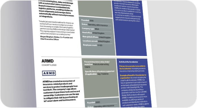 28New products/ MGA – Alumni profilesLloyd’s Lab Impact Report 29 Aanika Biosciences Focus in insurance value chain/Activity in the AcceleratorAnansi Focus in insurance value chain/ Activity in the Accelerator COHORT , workflow: Point of underwritingCOHORT , workflow: Point of underwriting Primary focus product area whilst in Primary focus product area whilst in Specific lines of business supported the Accelerator: Parametric, Specific lines of business supported the Accelerator: Supply chain/NDBI (if applicable): SpecialitySupply chain/NDBI (if applicable): Corporate, SME Example of benefit of Accelerator to Example of benefit of Accelerator to During the Lloyd's Lab organisation: organisation: In the Lab, Aanika Accelerator, Anansi adapted its existing Aanika Biosciences has created biological created a new rating model that Anansi underwrites goods in transit goods in transit insurance oering for tags that allow food to be traced through streamlined its underwriting process insurance for retailers in the UK. It oers small and medium-sized enterprises supply chains and the risk of pathogenic and parametric policy form. Capacity policies covering loss, delay and damage (SMEs) to create a new goods in transit contamination to be mitigated. It has was provided during or soon after the with an automated claims experience. insurance product suitable for covering developed a parametric food recall and Cohort.Anansi’s insurance is embedded into last mile shipments by large contamination insurance policy for food logistics platforms, enabling retailers to e-commerce retailers. Anansi received producers, which uses biotechnology as insure shipments and manage claims capacity from insurers and partnered part of the parametric trigger. This automatically without manual processes with seed investors during the cohort. product will greatly accelerate the Founded: 2018or integrations. Founded: 2018 process of pathogen identification from days to weeks down to a few hours, and Status: Operating, still in insurance“ Lloyds Lab was transformational for Anansi: we Status: Operating, still in insurance minimise cost for insureds. worked with our mentors to adapt our product Company type: Insurerfrom focussing on smaller third-party logistics Company type: MGA “ Participation in the Lloyd’s Lab proved partners serving SMEs to the large retail market. transformative for Aanika. The adept leadership Head oce: USAThe ongoing support in becoming a coverholder Head oce: United Kingdom and mentorship provided strategic guidance. will be instrumental in our scaling journey.” Main global oces: USA Main global oces: United Kingdom Access to industry experts enriched our Megan Bingham-Walker, Co-Founder and understanding of the market landscape. Locations served: GlobalChief Executive OcerLocations served: United Kingdom Collectively, this led to achievements which amplified our reach and expanded our Employee count: 11-100 Employee count: 11-100 opportunity to further innovate.” Catherine Besselman, Senior Vice President, Underwriting AlteliumFocus in insurance value chain/Activity in the AcceleratorARMDFocus in insurance value chain/ Activity in the Accelerator COHORT , workflow: Point of underwritingCOHORT , workflow: Point of underwriting, Primary focus product area whilst in Claims Primary focus product area whilst in Specific lines of business supported the Accelerator: Batteries the Accelerator: Increasing access to Corporate Specific lines of business supported (if applicable): insurance, Improving claims process Example of benefit of Accelerator to (if applicable): Gig, Freelance organisation: The Lab provided Example of benefit of Accelerator to Altelium with access to insurance organisation: As a result of joining the Altelium is an MGA focused on specialty capacity providers and brokers which in ARMD has created an ecosystem of Lloyd's Lab Accelerator, ARMD now battery insurance. It oers warranties, turn has led to opportunities for the insurance-related products and has an agreement in principle to launch insurance and data analytics on battery company in the stationary storage and services to protect tradespeople from an itemised, embedded tool insurance health, helping battery owners electric vehicle markets. During tool theft. The company’s app allows product with Greenlight Re. The throughout the lifetime of their electric Altelium’s time as part of Cohort 9, the customers to purchase tools and record company will also be launching a vehicles or battery energy storage company developed a Third Party ownership. Customers can use the app parametric tool hire voucher with MIC systems. Altelium oers its insurance, Liability product specifically for battery to mitigate their risk by purchasing an Global. Both products will support analytics on battery portfolios and energy stationary storage systems. As IoT smart alarm and tool insurance. ARMD in making tool insurance more predictive data via its platform. Founded: 2019a result of this Altelium was able to Founded: 2020 available, by oering a variety of secure Third Party Liability capacity products and distribution methods to “It was honour for us to have taken part in Status: Operating, still in insurancewith a global A rated insurer.Status: Operating, still in insurancesuit customers' needs. ARMD is able to the 2022 programme, and the input from reduce the time taken for claims the mentors was world class.” Company type: MGA Company type: Data provider, MGA processing to 5 days, well below the Ed Grimston, Co-founderHead oce: United Kingdom Head oce: United Kingdom industry average of 5-6 weeks. Main global oces: United Kingdom Main global oces: United Kingdom Locations served: Global Locations served: United Kingdom Employee count: 1-10 Employee count: 1-10 © Lloyd’s © Lloyd’s