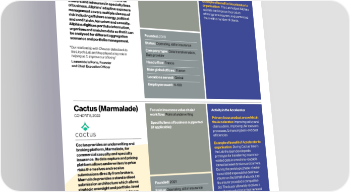68 Process Optimisation – Alumni profiles Lloyd’s Lab Impact Report 69 Allphins Focus in insurance value chain/ Activity in the Accelerator CarbonChain Focus in insurance value chain/ Activity in the Accelerator COHORT , workflow: Point of underwriting, COHORT , workflow: Point of underwriting, Loss modelling & analytics Primary focus product area whilst in Compliance & regulatory support Primary focus product area whilst in the Accelerator: New sources of risk the Accelerator: New sources of risk Specific lines of business supported insight - data or models, Enhancing Specific lines of business supported insight - data or models (if applicable): Speciality, Reinsurance back-end data eciencies (if applicable): Corporate, Speciality Example of benefit of Accelerator to Example of benefit of Accelerator to organisation: CarbonChain’s original Allphins provides portfolio exposure data organisation: The Lab helped Allphins CarbonChain provides a platform that proposal was to build a new database analytics and technology solutions for validate and improve its product enables companies to track, report and for marine underwriters to allow them to insurers and reinsurers in specialty lines oerings to reinsurers, and connected reduce their supply chain emissions. The understand the emissions of vessels of business. Allphins’ adaptive exposure them with a number of clients. company focuses on the most carbon- they are insuring. During development, management covers multiple classes of intensive industries including metals, the team noticed a potential for the risk including oshore energy, political mining, agriculture and manufacturing. technology to work across wider and credit risks, terrorism and casualty. CarbonChain’s clients are manufacturers, underwriting portfolios for larger Allphins digitises portfolio information, banks, commodities traders and freight industrial conglomerates. With Tokio organises and enriches data so that it can Founded: 2018 companies. Founded: 2019 Marine Kiln, they explored this idea and, be analysed for dierent aggregation following a successful trial using a small scenarios and portfolio management. Status: Operating, still in insurance Status: Operating, still in insurance data set during the Accelerator (inferred) programme, launched a live project “ Our relationship with Chaucer dates back to Company type: Data transformation, looking at a portfolio of approximately the Lloyd’s Lab and they played a key role in Data provider Company type: Software provider 2,000 companies. helping us to improve our offering” Head oce: France Head oce: United Kingdom Laurent de la Porte, Founder A methodology framework was and Chief Executive Officer Main global oces: France Main global oces: United Kingdom developed to measure customers’ emissions and compare them with their Locations served: Global Locations served: Global industry and regional peers, translating Employee count: 11-100 Employee count: 11-100 this into a “carbon risk rating” that could be taken into account when considering each policy at the point of underwriting. Cactus (Marmalade) Focus in insurance value chain/ Activity in the Accelerator Clausematch Focus in insurance value chain/ Activity in the Accelerator COHORT , workflow: Point of underwriting COHORT , workflow: Compliance & regulatory Primary focus product area whilst in support Primary focus product area whilst in Specific lines of business supported the Accelerator: Improving policy and the Accelerator: Ancillary, (if applicable): claims admin, Improving UW tools and Specific lines of business supported accountancy and regulatory processes, Enhancing back-end data (if applicable): compliance services eciencies Example of benefit of Accelerator to Cactus provides an underwriting and Example of benefit of Accelerator to Clausematch is used by insurers’ and organisation: During the Accelerator, broking platform, Marmalade, for organisation: During Cactus’ time in other financial service businesses’ risk Clausematch was able to create an commercial casualty and specialty the Lab the team developed a and compliance teams to create and insurance focused product, which insurance. Its data capture and pricing prototype for transferring insurance- manage internal company policy. involved retraining its AI models to platform allows underwriters to price related data in a machine-readable Clausematch will also help businesses analyse topics, themes and key words risks themselves and receive format between brokers and carriers. manage changes in industry-wide to understand insurance-specific submissions directly from brokers. During the prototype phase, a broker regulation that aect company policies regulations. Marmalade provides a standardised transmitted a speculative deal to an through its management capabilities. submission architecture which allows Founded: 2021 insurer on the behalf of a buyer, and Customers can use Clausematch to Founded: 2012 strategic oversight and portfolio-level the insurer provided a competitive generate insight reports and track new analysis from insurers’ actuarial team, Status: Operating, still in insurance bid. The buyer ultimately received a compliance requirements, including Status: Acquired by Corlytics Group reducing bottlenecks significant reduction in their renewal adherence to financial crime regulations. in 2023 and turnaround time. Company type: Administration system quote, saving tens of thousands of dollars. Company type: Administration system Head oce: Bermuda Head oce: United Kingdom Main global oces: Bermuda Main global oces: United Kingdom Locations served: Global Locations served: Global Employee count: 1-10 Employee count: 11-100 © Lloyd’s