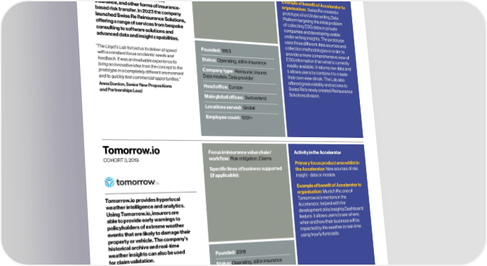 102Data and models – Alumni profilesLloyd’s Lab Impact Report 103 Spacebands Focus in insurance value chain/Activity in the AcceleratorSwiss Re Focus in insurance value chain/ Activity in the Accelerator COHORT , workflow: Risk mitigation, Loss COHORT , workflow: Point of underwriting modelling & analytics, Claims Primary focus product area whilst in Primary focus product area whilst in the Accelerator: New sources of risk Specific lines of business supported the Accelerator: New sources of risk Specific lines of business supported insight - data or models, Improving (if applicable): Corporate insight - data or models, Data, product & (if applicable): claims process service consolidator Example of benefit of Accelerator to Example of benefit of Accelerator to spacebands provide businesses with organisation: Conversations in the The Swiss Re Group is one of the world’s organisation: Swiss Re created a wearable devices which detect if an Lab helped to shape the company’s leading providers of reinsurance, prototype of an Underwriting Data employee is in the proximity of a insurance oering and go-to-market insurance, and other forms of insurance- Platform targeting the initial problem workplace hazard and at risk of being strategy. Through conversations in the based risk transfer. In 2023 the company of collecting ESG data on private injured. Users can use the spacebands Accelerator, spacebands realised that launched Swiss Re Reinsurance Solutions, companies and developing usable website and mobile app to monitor its proposed insurance dashboard oering a range of services from bespoke underwriting insights. The prototype hazards, oer wellness reminders concept did not work as intended. In its consulting to software solutions and uses three dierent data sources and and receive employee feedback.place, the company created a advanced data and insight capabilities. collection methodologies in order to Founded: 2020downloadable, digestible report for Founded: 1863 provide a more comprehensive view of each insured customer. “The Lloyd's Lab forced us to deliver at speed ESG information than what is currently Status: Operating, still in insurancewith a constant focus on clients' needs and Status: Operating, still in insurance readily available. It returns raw data and spacebands also uncovered some key feedback. It was an invaluable experience to it allows users to combine it to create Company type: Data providerfeatures that were missing from its bring an innovative idea from the concept to the Company type: Reinsurer, Insurer, prototype in a completely different environment Data models, Data provider their own view of risk. The Lab also Head oce: United Kingdomproduct oering which they are now and to quickly test commercial opportunities.” oered great visibility and access to looking to add, such as gas detection Head oce: Europe Swiss Re’s newly created Reinsurance Main global oces: United Kingdomand working-at-height monitoring.Anna Bordon, Senior New Propositions and Partnerships Lead Solutions division. Main global oces: Switzerland Locations served: United Kingdom Locations served: Global Employee count: 1-10 Employee count: 1001+ Sustema Focus in insurance value chain/Activity in the AcceleratorTomorrow.io Focus in insurance value chain/ Activity in the Accelerator COHORT , workflow: Point of underwriting COHORT , workflow: Risk mitigation, Claims Primary focus product area whilst in Primary focus product area whilst in Specific lines of business supported the Accelerator: New sources of risk Specific lines of business supported the Accelerator: New sources of risk Corporate (if applicable): (if applicable): insight - data or models insight - data or models Example of benefit of Accelerator to Example of benefit of Accelerator to organisation: During the 10-week organisation: Munich Re, one of Sustema behavioural analytics provides programme, Sustema was able to Tomorrow.io provides hyperlocal Tomorrow.io’s mentors in the commercial insurers with a comparative stress test its business hypothesis weather intelligence and analytics. Accelerator, helped with the analysis of the corporate behaviour of with market participants, and the Using Tomorrow.io, insurers are development of its Insights Dashboard over 17,000 companies worldwide. constructive feedback from doing so, able to provide early warnings to feature. It allows users to see where, Sustainability and ESG are components helped to refine their business model policyholders of extreme weather when and how their business will be of sound corporate behaviour that is and value proposition. As a result, events that are likely to damage their impacted by the weather in real-time analysed by Sustema behavioural Sustema was able to develop Sustema property or vehicle. The company’s using hourly forecasts. analytics (BASE).BASE, which is a user-friendly product historical archive and real-time Founded: 2017that enables improved underwriting weather insights can also be used Founded: 2016 “We found that Lloyds Market was a very good profitability and makes ESG metrics for claim validation. fit with our mission – to ‘help companies action Status: Operating, still in insuranceactionable in the core business of Status: Operating, still in insurance regulatory change’. Our regulatory change underwriting. management solution could quickly be Company type: Data provider Company type: Data provider adapted to individual needs of Lloyds Market participants to track and action relevant Head oce: Switzerland Head oce: North America regulatory developments.” Main global oces: Switzerland Main global oces: USA Helen Dann, Co-Founder and Chief Customer OfficerLocations served: Global Locations served: USA (but potentially other areas too, USA is the Employee count: 1-10 only one confirmed) Employee count: 201-500 © Lloyd’s