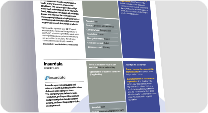 88Data and models – Alumni profilesLloyd’s Lab Impact Report 89 Hailios Focus in insurance value chain/Activity in the AcceleratorICEYE Focus in insurance value chain/ Activity in the Accelerator COHORT , workflow: Loss modelling & analytics, COHORT , workflow: Loss modelling & analytics, Claims Primary focus product area whilst in Claims Primary focus product area whilst in the Accelerator: New sources of risk the Accelerator: Improving claims Specific lines of business supported insight - data or models, Improving Specific lines of business supported process (if applicable): Corporate, SME, claims process (if applicable): Personal, Corporate, Speciality, Reinsurance SME, Speciality, Reinsurance, Example of benefit of Accelerator to Example of benefit of Accelerator to Government organisation: ICEYE worked in the Hailios has created compact sensors organisation: ICEYE uses its own constellation of Lab on a solution to help distinguish which detect and analyse hail. Its sensors synthetic aperture radar satellites to between damage caused by water and are installed at policyholders’ locations to provide constant monitoring across the damage caused by wind from a tropical allow parametric insurance pay-outs to world, at any time and in any weather storm. It also got support in building its be triggered by localised hail data. Hailios conditions. The company produces high wildfire damage solution. sensors are used for parametric hail water mark estimates within 24 hours of a insurance in industries including flood, helping insurers to quickly estimate automotive, agriculture, renewable losses and improve the claims process. energy, and commercial property.Founded: 2017The company is also developing persistent Founded: 2014 monitoring solutions for wildfires and can Status: Operating, still in insurancesupport parametric insurance products.Status: Operating, still in insurance Company type: Data provider“Taking part in Lloyds Lab gave ICEYE superb Company type: Data provider Head oce: USAexposure to the market and the opportunity to Head oce: Finland gain hugely valuable insight into the way in which Main global oces: USAmarket participants can get value from utilising Main global oces: Finland our unique Nat Cat solutions. We’re finding Locations served: USA, Australiacontinued involvement highly beneficial.”Locations served: Global Stephen Lathrope, Global Head of Insurance Employee count: 11-100 Employee count: 201-500 HazardHub Focus in insurance value chain/Activity in the AcceleratorInsurdata Focus in insurance value chain/ Activity in the Accelerator (Guidewire) workflow: Point of underwriting COHORT , workflow: Point of underwriting Primary focus product area whilst in Primary focus product area whilst in COHORT , Specific lines of business supported the Accelerator: New sources of risk Specific lines of business supported the Accelerator: New sources of risk Personal, Corporate, (if applicable): (if applicable): insight - data or models insight - data or models SME Example of benefit of Accelerator to Example of benefit of Accelerator to organisation: HazardHub was able to organisation: After their time in the HazardHub informs insurers if a access data from 23,000 claims from Insurdata provides insurers and cohort, Insurdata was acquired by commercial or residential property risk Managing Agents that it used to verify reinsurers with building-level location Big Ticket and continues to act as a is high or low in seconds. The company its product oering. The Lab helped to data and geocoding services. wholly-owned subsidiary. Earlier this provides key attributes such as property prove the value of HazardHub models The company specialises in high- year, Big Ticket launched their digital use code, year built and square footage. when assessing hurricane, wind and resolution, peril-specific exposure infrastructure for commercial insurance It also offers hazard data and scores for storm surge risks. This proof has and property risk data to support using Insurdata’s technology as a a wide range of perils including flood, allowed syndicates to quickly and pricing, underwriting and portfolio foundation. subsidence, earthquake and wildfire.accurately assess the risk for any management. Founded: 2016existing or prospective book of US Founded: 2017 “The Lab was a fantastic partner in the London property business. market and super-accelerated our success and Status: Operating, still in insurance - Status: Acquired by Big Ticket (in 2022 eventual exit!”division of Guidewire Software, Inc - inferred) Bob Frady, Vice President Company type: Data provider Company type: Data provider Head oce: North America Head oce: North America Main global oces: USA Main global oces: USA Locations served: USA Locations served: Global Employee count: 1001+ Employee count: 1-10 © Lloyd’s