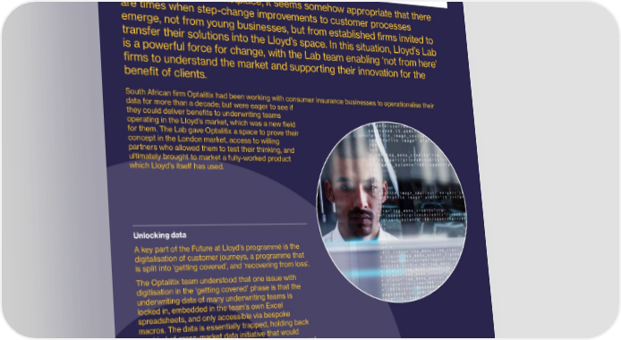 72 Process Optimisation Lloyd’s Lab Impact Report 73 Sharing knowledge to manage risk But their product had not been tried within the London Cohort 4, 2020 insurance market. This established business needed access to testing opportunities and the expertise of the Lab ecosystem to help it rebuild its product to work for commercial P&C insurers. Optalitix joined the Lab programme and they were In a centuries-old marketplace, it seems somehow appropriate that there assigned six mentors, including one from the Future at are times when step-change improvements to customer processes Lloyd’s team. The mentors supplied over a dozen models for Optalitix to test-convert. This gave Optalitix emerge, not from young businesses, but from established 昀椀rms invited to a bank of valuable proof-of-concept case studies, and transfer their solutions into the Lloyd’s space. In this situation, Lloyd’s Lab the opportunity to see clearly what was needed to drive the digitisation of P&C customer journeys. is a powerful force for change, with the Lab team enabling ‘not from here’ Optalitix found that their participation in the Lab 昀椀rms to understand the market and supporting their innovation for the provided real insight into the Lloyd’s market and the bene昀椀t of clients. software systems that drive it. As a result, they are now not only already working directly with syndicates, but also building a quote system for Lloyd’s which South African 昀椀rm Optalitix had been working with consumer insurance businesses to operationalise their embeds their software into some of the processes that data for more than a decade; but were eager to see if are already underway within the Future at Lloyd’s. An they could deliver bene昀椀ts to underwriting teams existing product has been guided into the market operating in the Lloyd’s market, which was a new 昀椀eld through the innovation process, supporting the for them. The Lab gave Optalitix a space to prove their marketwide initiatives to digitise underwriting data, as concept in the London market, access to willing well as providing process improvements for individual partners who allowed them to test their thinking, and market 昀椀rms. ultimately brought to market a fully-worked product which Lloyd’s itself has used. The Optalitix team say “you have to enter a new market by considering what you can do for it, not what it can do for you”. Participation in the Lab has meant they can do just that. Unlocking data A key part of the Future at Lloyd’s programme is the digitalisation of customer journeys, a programme that is split into ‘getting covered’, and ‘recovering from loss’. The Optalitix team understood that one issue with digitisation in the ‘getting covered’ phase is that the underwriting data of many underwriting teams is locked in, embedded in the team’s own Excel spreadsheets, and only accessible via bespoke macros. The data is essentially trapped, holding back any kind of cross-market data initiative that would improve the ease of getting quotes for clients, or speed up the underwriting process for them. However, Optalitix had an existing product, Acumen, that was designed to draw data from any Excel spreadsheet and convert it into 昀氀exible API data. Acumen allows previously ‘trapped’ data to be embedded into other systems, meaning that a group of individual underwriting data sets can be quickly and easily shared into a format that is signi昀椀cantly more scalable. © Lloyd’s