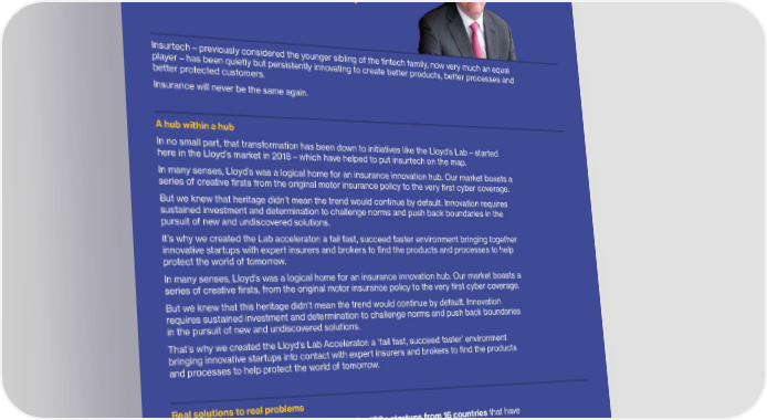 05 04 Lloyd’s Lab Impact Report 05 John Neal, CEO, Lloyd’s Dedicated themes have shaped and directed our cohorts towards the issues of the time, from data use to decarbonisation. Mentors and sponsors Five years of pushing boundaries. – over 700 of them – have helped participants re昀椀ne their models and sharpen their thinking. And Since 2018, there’s been a revolution at every stage, insurers have lent their commercial underway in the insurance industry. insights to ensure we’re solving the risks and pinch points people really care about. It’s perhaps why the Lab today boasts a 95% success rate (still operating or successfully bought out) – because these are solutions designed for society’s bene昀椀t; products designed Insurtech – previously considered the younger sibling of the 昀椀ntech family, now very much an equal to meet people’s needs and make processes player – has been quietly but persistently innovating to create better products, better processes and simpler. better protected customers. Sensitive coverage for the costs and uncertainty Insurance will never be the same again. of fertility treatment. Hyper-accurate modelling for wild昀椀res and 昀氀oods. Geospatial monitoring for political developments and environmental trends. A hub within a hub I’m cherry-picking – but you’ll forgive me for doing so with a list of a hundred to choose from... all of In no small part, that transformation has been down to initiatives like the Lloyd’s Lab – started which are detailed in this report. here in the Lloyd’s market in 2018 – which have helped to put insurtech on the map. In many senses, Lloyd’s was a logical home for an insurance innovation hub. Our market boasts a series of creative 昀椀rsts from the original motor insurance policy to the very 昀椀rst cyber coverage. Innovation: a team game But we knew that heritage didn’t mean the trend would continue by default. Innovation requires We’re incredibly proud to have hosted this sustained investment and determination to challenge norms and push back boundaries in the pioneering hub at Lloyd’s. It’s been everything we pursuit of new and undiscovered solutions. wanted and more: a jewel in our crown, and a bee It’s why we created the Lab accelerator: a fail fast, succeed faster environment bringing together in our bonnet – challenging us to embrace new innovative startups with expert insurers and brokers to 昀椀nd the products and processes to help ways of thinking and go further and faster in protect the world of tomorrow. innovating to insure society’s risks. In many senses, Lloyd’s was a logical home for an insurance innovation hub. Our market boasts a Of course, that success has been a huge team series of creative 昀椀rsts, from the original motor insurance policy to the very 昀椀rst cyber coverage. e昀昀ort. I’m particularly grateful to the Lloyd’s Lab leadership who worked through the Covid-19 But we knew that this heritage didn’t mean the trend would continue by default. Innovation pandemic to keep the (virtual) show on the road requires sustained investment and determination to challenge norms and push back boundaries – and also the hundreds of market participants in the pursuit of new and undiscovered solutions. who have lent their time and expertise in That’s why we created the Lloyd’s Lab Accelerator: a ‘fail fast, succeed faster’ environment mentoring Lab participants. bringing innovative startups into contact with expert insurers and brokers to 昀椀nd the products The outcome has been a raft of success stories and processes to help protect the world of tomorrow. pointing to insurance’s enduring relevance in helping people make braver, smarter decisions in the face of uncertainty. It shows what’s possible Real solutions to real problems when insurers, investors, academics and others Five years later, its success has been clear in the 100+ startups from 16 countries that have come together to solve shared problems. come through the Lab – and the $1 billion of capital that has been raised for the solutions This report is a testament to that collaboration: a coming out the other side. library of shared achievements. We’re excited to see how the next 昀椀ve years take us over oceans, This report details those pioneering ideas, over 昀椀ve eventful years of mould-breaking and risk- across industries and into new territory as we taking. continue innovating to create a braver world. In some senses, it reads more like a list of what’s happened in the world since 2018 – and that’s because the Lab was designed with that exact purpose in mind: to align our industry’s innovation with the outside world’s news cycle. © Lloyd’s