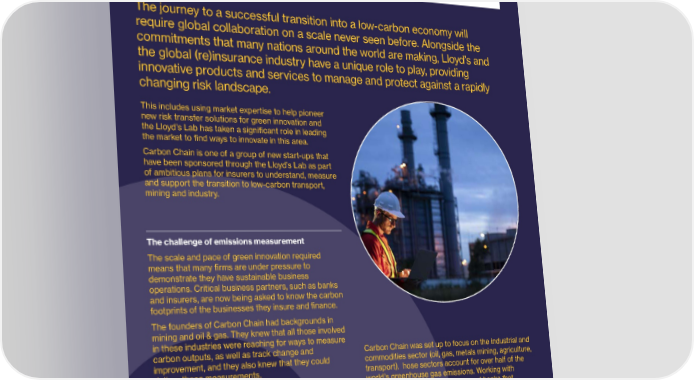 78 Process Optimisation Lloyd’s Lab Impact Report 79 Carbon Risk Rating – greater transparency Moving from the Lab to a live pilot The team at Carbon Chain readily admit they: new Tokio Marine Kiln and Carbon Chain began exploring on the path to net zero nothing about the insurance market. Through the the idea of measuring emissions across whole Cohort 6, 2021 programme we were able to meet senior stakeholders insurance portfolios for large clients and, following a who were extremely supportive of green innovation. successful trial using a small data set during the Lab We also learned how to design our o昀昀ering in a way programme, have now jointly launched a live project that makes sense to Lloyd’s members. On the other looking at a portfolio of approximately 2,000 hand, as we already work with a number of banks and companies. large corporates, we were able to bring those lessons Tokio Marine Kiln and Carbon Chain have a The journey to a successful transition into a low-carbon economy will to our conversations with the insurance industry and in methodology framework to measure customers’ turn help them to understand what best practice looks require global collaboration on a scale never seen before. Alongside the emissions and compare them with their industry and like elsewhere”. regional peers, translating this into a ‘carbon risk rating’ commitments that many nations around the world are making, Lloyd’s and The original Carbon Chain proposal was to build a new that Tokio Marine Kiln can take into account when the global (re)insurance industry have a unique role to play, providing database for maritime and marine underwriters, to considering each policy it is underwriting. allow them to understand the emissions of vessels they innovative products and services to manage and protect against a rapidly Tokio Marine Kiln recognised the wider value of what is are insuring, and this was the 昀椀rst pilot project in the being built and Brad Irick, Chief Executive O昀漀cer of changing risk landscape. Lab, designed in partnership with Atrium, a Tokio Marine Kiln said: “The bene昀椀ts of this technology longstanding insurer in the Lloyd’s market, who see a extend beyond Tokio Marine Kiln and present an This includes using market expertise to help pioneer carbon emissions ratings database being an integral opportunity for the whole market and society more new risk transfer solutions for green innovation and part of the marine industry’s decarbonisation e昀昀orts. generally.” the Lloyd’s Lab has taken a signi昀椀cant role in leading However, as the team developed the product, they the market to 昀椀nd ways to innovate in this area. Carbon Chain’s work is only just beginning. In future began to see how their technology might work across project phases, customers will be made aware of their Carbon Chain is one of a group of new start-ups that wider underwriting portfolios for larger industrial ratings based on reported data or industry have been sponsored through the Lloyd’s Lab as part conglomerates, and they undertook a second pilot benchmarks. Customers who are not already of ambitious plans for insurers to understand, measure project with Tokio Marine Kiln (TMK). measuring and reporting emissions data will be and support the transition to low-carbon transport, encouraged to do this to further improve transparency mining and industry. and begin to reduce their emissions scores. The challenge of emissions measurement The scale and pace of green innovation required means that many 昀椀rms are under pressure to demonstrate they have sustainable business operations. Critical business partners, such as banks and insurers, are now being asked to know the carbon footprints of the businesses they insure and 昀椀nance. The founders of Carbon Chain had backgrounds in mining and oil & gas. They knew that all those involved in these industries were reaching for ways to measure carbon outputs, as well as track change and Carbon Chain was set up to focus on the industrial and improvement, and they also knew that they could commodities sector (oil, gas, metals mining, agriculture, deliver these measurements. transport). hose sectors account for over half of the world’s greenhouse gas emissions. Working with commodities traders, producers, and banks that 昀椀nance commodities products, the team built out a database of emissions information on speci昀椀c commodity supply chains, plus globally signi昀椀cant, mines, smelters, re昀椀neries, cargo vessels and so on. As the database of emissions grew, Carbon Chain began to understand their data could be valuable to insurers who wished to run climate stress tests on potential clients before insuring them. © Lloyd’s