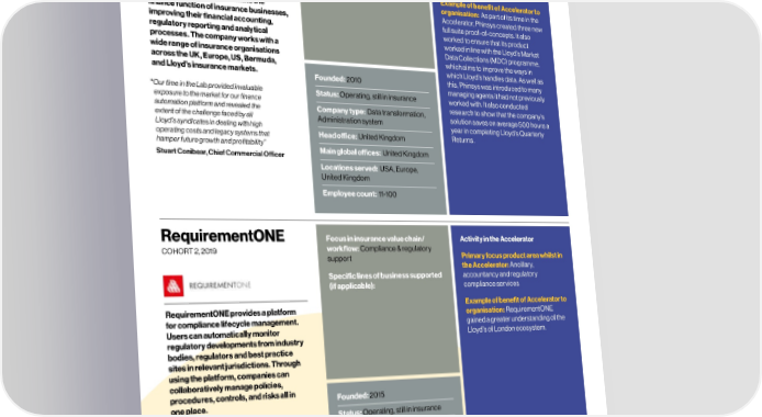 80 Process Optimisation – Alumni profiles Lloyd’s Lab Impact Report 81 Phinsys Focus in insurance value chain/ Activity in the Accelerator Retechnica Focus in insurance value chain/ Activity in the Accelerator COHORT , workflow: Compliance & regulatory COHORT , workflow: Point of underwriting, support Primary focus product area whilst in Claims Primary focus product area whilst in the Accelerator: Ancillary, the Accelerator: Improving policy and Specific lines of business supported accountancy and regulatory Specific lines of business supported claims admin, Improving UW tools and (if applicable): Corporate compliance services (if applicable): processes, Enhancing back-end data eciencies, Improving claims process Example of benefit of Accelerator to Phinsys has built a platform of software organisation: As part of its time in the Retechnica is an artificial intelligence Example of benefit of Accelerator to tools to optimise and automate the Accelerator, Phinsys created three new company. Its product Ingenia helps organisation: During its time in the finance function of insurance businesses, full suite proof-of-concepts. It also companies automatically extract Lab, Retechnica made contact with improving their financial accounting, worked to ensure that its product and analyse information from their several insurance businesses and had regulatory reporting and analytical worked in line with the Lloyd’s Market documents, helping them to automate in-depth conversations with some to processes. The company works with a Data Collections (MDC) programme, manual processes and to extract insights support Retechnica’s go-to-market wide range of insurance organisations which aims to improve the ways in from large amounts of content. strategy in insurance. across the UK, Europe, US, Bermuda, which Lloyd’s handles data. As well as and Lloyd’s insurance markets. Founded: 2010 this, Phinsys was introduced to many “It was a pleasure to participate in the Lloyd's Lab. Founded: 2012 managing agents it had not previously It enabled Retechnica, an AI solution provider, “ Our time in the Lab provided invaluable Status: Operating, still in insurance worked with. It also conducted to get in-depth exposure to key actors in the Status: Operating, still in insurance exposure to the market for our finance insurance market, leading us to the development automation platform and revealed the Company type: Data transformation, research to show that the company’s of highly innovative and relevant solutions” Company type: Data transformation extent of the challenge faced by all Administration system solution saves on average 500 hours a Marco Lannone, Founder and Lloyd’s syndicates in dealing with high year in completing Lloyd’s Quarterly Chief Executive Officer Head oce: United Kingdom operating costs and legacy systems that Head oce: United Kingdom Returns. hamper future growth and profitability” Main global oces: United Kingdom Main global oces: United Kingdom Stuart Conibear, Chief Commercial Officer Locations served: Global Locations served: USA, Europe, United Kingdom Employee count: 1-10 Employee count: 11-100 RequirementONE Focus in insurance value chain/ Activity in the Accelerator Scrub AI Focus in insurance value chain/ Activity in the Accelerator COHORT , workflow: Compliance & regulatory COHORT , workflow: Point of underwriting support Primary focus product area whilst in Primary focus product area whilst in the Accelerator: Ancillary, Specific lines of business supported the Accelerator: Enhancing back-end Specific lines of business supported accountancy and regulatory (if applicable): data eciencies (if applicable): compliance services Example of benefit of Accelerator to Example of benefit of Accelerator to organisation: Before taking part in the RequirementONE provides a platform organisation: RequirementONE Scrub AI provides an AI solution for Accelerator, Scrub AI oered a solution for compliance lifecycle management. gained a greater understanding of the automating data cleansing from to automate data cleaning in SOVs for Users can automatically monitor Lloyd’s of London ecosystem. spreadsheets. It uses optical the RMS output format. During the Lab, regulatory developments from industry character recognition technology Scrub AI extended this oering from the bodies, regulators and best practice and machine learning to extract RMS to the AIR data output format. sites in relevant jurisdictions. Through relevant information. Using the using the platform, companies can platform, SOVs and bordereaux collaboratively manage policies, can be cleaned and validated in procedures, controls, and risks all in Founded: 2015 seconds and outputted into RMS, Founded: 2020 one place. AIR, Sequel Impact or customised Status: Operating, still in insurance formats. Status: Operating, still in insurance “We found that Lloyds Market was a very good fit with our mission – to ‘help companies action Company type: Administration system Company type: Data transformation regulatory change’. Our regulatory change management solution could quickly be Head oce: United Kingdom Head oce: United Kingdom adapted to individual needs of Lloyds Market Main global oces: United Kingdom Main global oces: United Kingdom participants to track and action relevant regulatory developments.” Locations served: Global Locations served: Global Helen Dann, Co-Founder and Chief Customer Officer Employee count: 1-10 Employee count: 1-10 © Lloyd’s