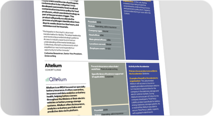 28 New products/ MGA – Alumni profiles Lloyd’s Lab Impact Report 29 Aanika Biosciences Focus in insurance value chain/ Activity in the Accelerator Anansi Focus in insurance value chain/ Activity in the Accelerator COHORT , workflow: Point of underwriting COHORT , workflow: Point of underwriting Primary focus product area whilst in Primary focus product area whilst in Specific lines of business supported the Accelerator: Parametric, Specific lines of business supported the Accelerator: Supply chain/NDBI (if applicable): Speciality Supply chain/NDBI (if applicable): Corporate, SME Example of benefit of Accelerator to Example of benefit of Accelerator to During the Lloyd's Lab organisation: organisation: In the Lab, Aanika Accelerator, Anansi adapted its existing Aanika Biosciences has created biological created a new rating model that Anansi underwrites goods in transit goods in transit insurance oering for tags that allow food to be traced through streamlined its underwriting process insurance for retailers in the UK. It oers small and medium-sized enterprises supply chains and the risk of pathogenic and parametric policy form. Capacity policies covering loss, delay and damage (SMEs) to create a new goods in transit contamination to be mitigated. It has was provided during or soon after the with an automated claims experience. insurance product suitable for covering developed a parametric food recall and Cohort. Anansi’s insurance is embedded into last mile shipments by large contamination insurance policy for food logistics platforms, enabling retailers to e-commerce retailers. Anansi received producers, which uses biotechnology as insure shipments and manage claims capacity from insurers and partnered part of the parametric trigger. This automatically without manual processes with seed investors during the cohort. product will greatly accelerate the Founded: 2018 or integrations. Founded: 2018 process of pathogen identification from days to weeks down to a few hours, and Status: Operating, still in insurance “ Lloyds Lab was transformational for Anansi: we Status: Operating, still in insurance minimise cost for insureds. worked with our mentors to adapt our product Company type: Insurer from focussing on smaller third-party logistics Company type: MGA “ Participation in the Lloyd’s Lab proved partners serving SMEs to the large retail market. transformative for Aanika. The adept leadership Head oce: USA The ongoing support in becoming a coverholder Head oce: United Kingdom and mentorship provided strategic guidance. will be instrumental in our scaling journey.” Main global oces: USA Main global oces: United Kingdom Access to industry experts enriched our Megan Bingham-Walker, Co-Founder and understanding of the market landscape. Locations served: Global Chief Executive Ocer Locations served: United Kingdom Collectively, this led to achievements which amplified our reach and expanded our Employee count: 11-100 Employee count: 11-100 opportunity to further innovate.” Catherine Besselman, Senior Vice President, Underwriting Altelium Focus in insurance value chain/ Activity in the Accelerator ARMD Focus in insurance value chain/ Activity in the Accelerator COHORT , workflow: Point of underwriting COHORT , workflow: Point of underwriting, Primary focus product area whilst in Claims Primary focus product area whilst in Specific lines of business supported the Accelerator: Batteries the Accelerator: Increasing access to Corporate Specific lines of business supported (if applicable): insurance, Improving claims process Example of benefit of Accelerator to (if applicable): Gig, Freelance organisation: The Lab provided Example of benefit of Accelerator to Altelium with access to insurance organisation: As a result of joining the Altelium is an MGA focused on specialty capacity providers and brokers which in ARMD has created an ecosystem of Lloyd's Lab Accelerator, ARMD now battery insurance. It oers warranties, turn has led to opportunities for the insurance-related products and has an agreement in principle to launch insurance and data analytics on battery company in the stationary storage and services to protect tradespeople from an itemised, embedded tool insurance health, helping battery owners electric vehicle markets. During tool theft. The company’s app allows product with Greenlight Re. The throughout the lifetime of their electric Altelium’s time as part of Cohort 9, the customers to purchase tools and record company will also be launching a vehicles or battery energy storage company developed a Third Party ownership. Customers can use the app parametric tool hire voucher with MIC systems. Altelium oers its insurance, Liability product specifically for battery to mitigate their risk by purchasing an Global. Both products will support analytics on battery portfolios and energy stationary storage systems. As IoT smart alarm and tool insurance. ARMD in making tool insurance more predictive data via its platform. Founded: 2019 a result of this Altelium was able to Founded: 2020 available, by oering a variety of secure Third Party Liability capacity products and distribution methods to “It was honour for us to have taken part in Status: Operating, still in insurance with a global A rated insurer. Status: Operating, still in insurance suit customers' needs. ARMD is able to the 2022 programme, and the input from reduce the time taken for claims the mentors was world class.” Company type: MGA Company type: Data provider, MGA processing to 5 days, well below the Ed Grimston, Co-founder Head oce: United Kingdom Head oce: United Kingdom industry average of 5-6 weeks. Main global oces: United Kingdom Main global oces: United Kingdom Locations served: Global Locations served: United Kingdom Employee count: 1-10 Employee count: 1-10 © Lloyd’s © Lloyd’s