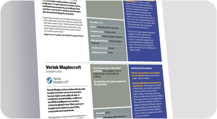 104 Data and models – Alumni profiles Value.Space Focus in insurance value chain/ Activity in the Accelerator COHORT , AND COHORT , workflow: Point of underwriting Primary focus product area whilst in Specific lines of business supported the Accelerator: Improving UW tools (if applicable): Corporate, SME, and processes Speciality, Reinsurance, Captive, Government Example of benefit of Accelerator to organisation: In Cohort 4, Value. Value.Space delivers satellite-based Space tailored its asset and portfolio- infrastructure risk assessments and level structural integrity audits for the monitoring to underwriters and risk insurance industry. It has been engineers. It specialises in mines, dams, delivering these risk assessments and business property, providing a fast globally to insurers ever since and and low-cost way to assess and monitor raising venture capital funding. After its the structural integrity of assets. time in the Lab, it evaluated that its risk assessments are ten times faster and “ Value.Space built its core product at Lloyd’s Lab Founded: 2022 25 times cheaper than alternative with underwriters and risk engineers, specifically methods of risk assessment. with their needs in mind. That has been invaluable Status: Operating, still in insurance for the company and is a key component in why In Cohort 10, Value.Space developed Value.Space is delivering to the Lloyd’s market, Company type: Data provider a liability model to help insurers across the world today.” Head oce: United Kingdom & Estonia understand how potential risks Reijo Pold, Founder and Chief Strategy Officer shown on asset risk assessments Main global oces: United Kingdom could materialise to a liability loss & Estonia event. This product is designed to help underwriters price policies and Locations served: Global advise clients. Employee count: 11-100 Verisk Maplecroft Focus in insurance value chain/ Activity in the Accelerator COHORT , workflow: Risk mitigation, Point of underwriting, Loss modelling & Primary focus product area whilst in analytics the Accelerator: New sources of risk insight - data or models Specific lines of business supported (if applicable): Example of benefit of Accelerator to organisation: Verisk Maplecroft used Verisk Maplecroft provides clients with its time in the Lab to identify and better insight and data on environmental, understand the potential market human rights and political risk. It opportunities in the realm of political combines sustainability, resilience violence underwriting. Having identified and ESG intelligence to create a these opportunities, Verisk Maplecroft coherent global view. Risk exposure then used the remainder of its time to insight is provided at a portfolio, adapt its existing Civil Unrest Index to corporate and asset level. create a global, subnational Strikes, Founded: 2001 Riots and Civil Commotion (SRCC) “Participating in Lloyd’s Lab truly catalysed our index to meet the requirements of the ability to create a new and innovative SRCC Status: Operating, still in insurance insurance industry. product for the insurance industry. The intensive timetable and continuous mentor engagement Company type: Data provider enabled us to move swiftly and confidently from high-level product conceptualisation to bringing Head oce: United Kingdom a viable solution to market unlike anything else that is used by political violence insurers today” Main global oces: United Kingdom James Allan, Head of Corporate Risk Locations served: Global and Sustainability Employee count: 101-200