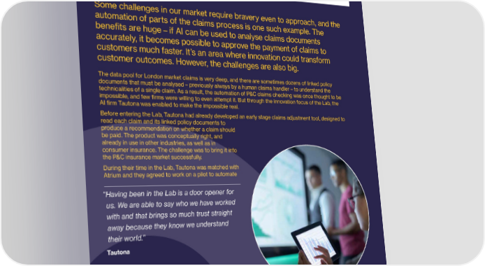 58 Claims Lloyd’s Lab Impact Report 59 Collaborative intelligence “In this case, our job was to tackle a huge for faster claims processing challenge and to take a step forward for the whole market. Claims automation has been a Cohort 3, 2019 goal for many years, but insurers needed a market-wide programme to innovate in this area; which is, of course, what the Lab is designed to facilitate. In this case, everyone Some challenges in our market require bravery even to approach, and the knew what we were trying to achieve was automation of parts of the claims process is one such example. The difficult and we collaborated to work at it bene昀椀ts are huge – if AI can be used to analyse claims documents together. This approach, along with the accurately, it becomes possible to approve the payment of claims to technology, absolutely delivered, and is a customers much faster. It’s an area where innovation could transform great demonstration of what can be customer outcomes. However, the challenges are also big. achieved in an open innovation space.” The data pool for London market claims is very deep, and there are sometimes dozens of linked policy Ed Gaze, Lloyd’s Lab manager documents that must be analysed – previously always by a human claims handler – to understand the technicalities of a single claim. As a result, the automation of P&C claims checking was once thought to be impossible, and few 昀椀rms were willing to even attempt it. But through the innovation focus of the Lab, the AI 昀椀rm Tautona was enabled to make the impossible real. Before entering the Lab, Tautona had already developed an early stage claims adjustment tool, designed to read each claim and its linked policy documents to produce a recommendation on whether a claim should be paid. The product was conceptually right, and already in use in other industries, as well as in The claims tool that was subsequently rolled out consumer insurance. The challenge was to bring it into has been trained on hundreds of thousands of the P&C insurance market successfully. claims and reads them as a human would, but During their time in the Lab, Tautona was matched with more accurately and within seconds, instead of Atrium and they agreed to work on a pilot to automate 2-3 hours. Tautona says that while human beings analyse claims at 95-96% accuracy, their system “ Having been in the Lab is a door opener for will deliver 98% accuracy. us. We are able to say who we have worked For Tautona, the Lab was a fantastic learning with and that brings so much trust straight experience and sharpened their focus. Previously, the team was focused on end-to-end claims away because they know we understand validation. However, they found a ‘golden nugget’ in their world.” the Lab – P&C policy coverage analysis – where automation could deliver huge bene昀椀ts in a big Tautona market. The Lab also opened up the US market for Tautona, and the 昀椀rm now works with carriers and TPAs in Canada and the US. Atrium’s delegated authority property claims for the US market. During the ten-week programme, they were together able to create a proof-of-concept model which showed how using the right AI could reduce costs and processing times while maintaining accuracy of results. © Lloyd’s